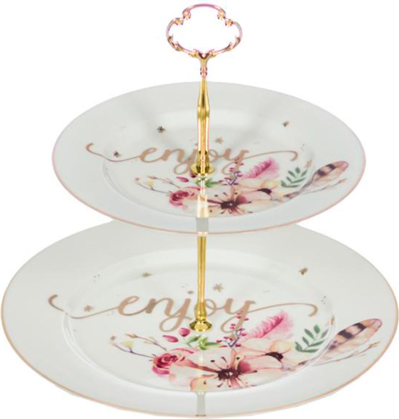 Dwupoziomowa patera idealnie nadaje się do wyeksponowania i serwowania wszelkiego rodzaju poczęstunków . Wykonana z ceramiki ze złotymi zdobieniami i kwiatami, gwarantuje gustowny i subtelny wygląd, jednocześnie zapewniając praktyczne zastosowanie.