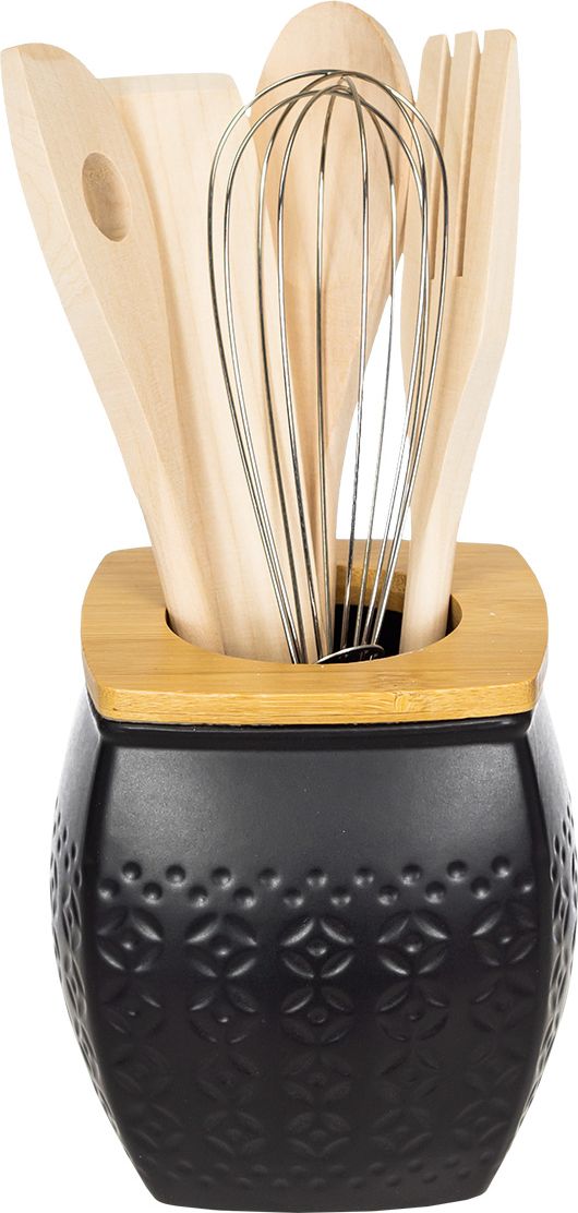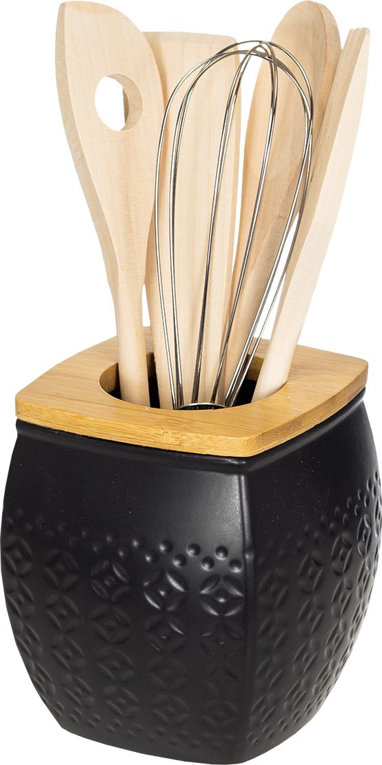 Drewniane akcesoria (łyżka, szpatułka, widelec, ubijaczka) w zestawie z ceramicznym pojemnikiem w kolorze czarnym Palomo.