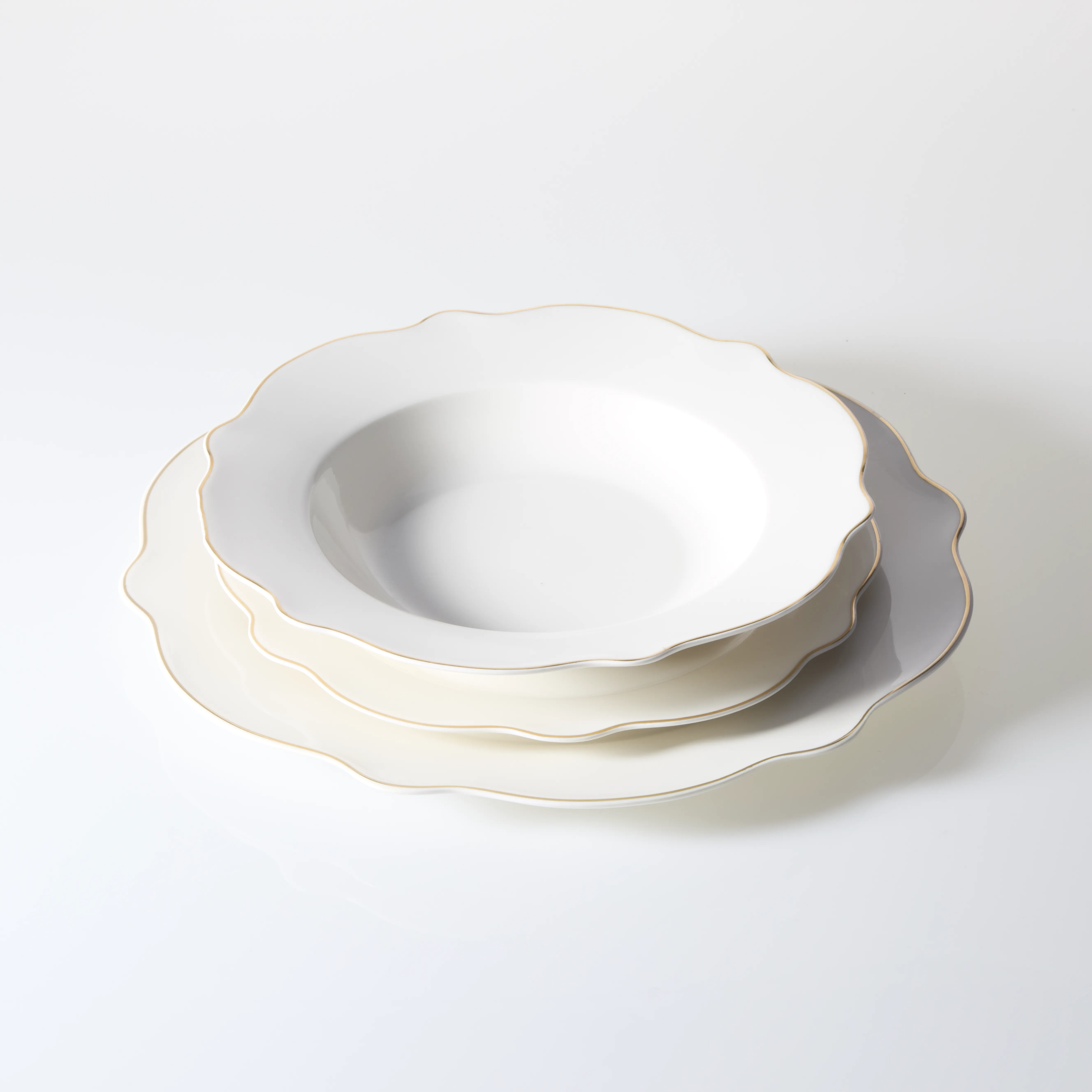 Zestaw talerzy obiadowych w kształcie kwiatu z kolekcji LEYA ze złotą obwódką zawiera 6x talerz głęboki śr. 22 cm, 6x talerz obiadowy śr. 26,5 cm, 6x talerz deserowy śr. 21 cm. Zestaw idealny zarówno na specjalne okazje jak i do codziennego użytku.