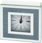 Elegancki szklany zegar Diamento w odcieniu grafitowym o wymiarach 15 x 15 x 5 cm zasilany za pomocą jednej baterii AA (nie dołączona do zestawu).