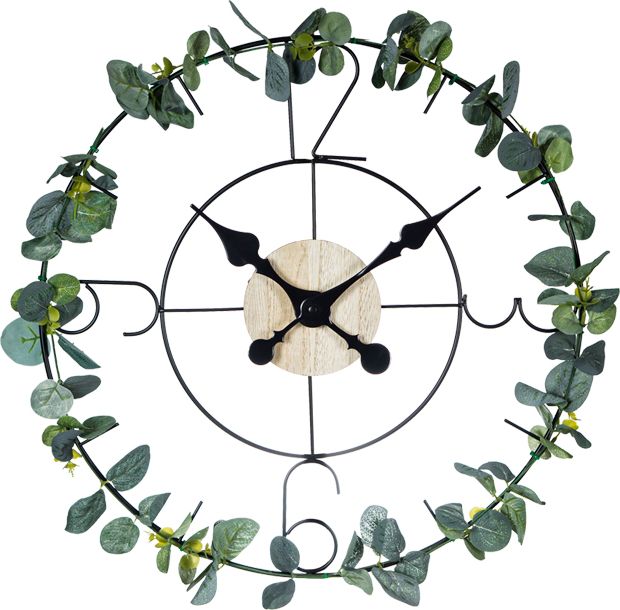 Zegar ścienny o średnicy 40 cm oraz 4.5 cm głębokości w kolorze czarnym z motywem liści eukalipusa, do złudzenia przypominającymi prawdziwą roślinę. Zasilany za pomocą jednej baterii AA (nie dołączona do zestawu).
