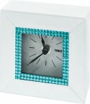 Elegancki szklany zegar Diamento w biało-niebieskim wykończeniu o wymiarach 12 x 12 x 5 cm zasilany za pomocą jednej baterii AA (nie dołączona do zestawu).
