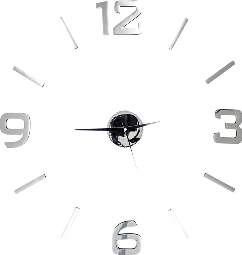 Elegancki zegar ścienny w kolorze srebrnym z cichym mechanizmem. Zestaw zawiera wszystkie elementy potrzebne do przyklejenia. Sugerowany rozmiar to 600 mm x 600 mm. Zegara nie można przyklejać na ścianach pokrytych tapetą. Zasilany za pomocą jednej baterii AA (nie dołączona do zestawu).