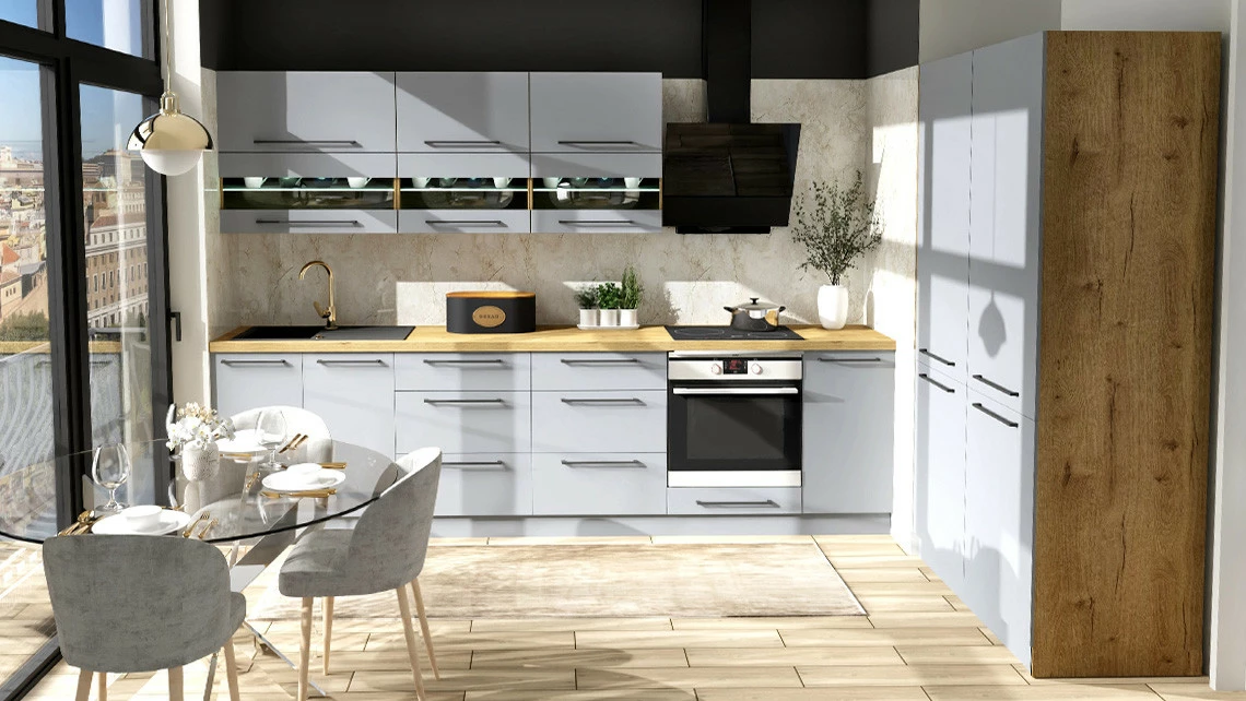 Kuchnia Monia w kolorze szarym to nowoczesne meble kuchenne, które pasują do stylu skandynawskiego oraz minimalistycznego. Z powodzeniem można je wykorzystać w małym, jak i w dużym pomieszczeniu.