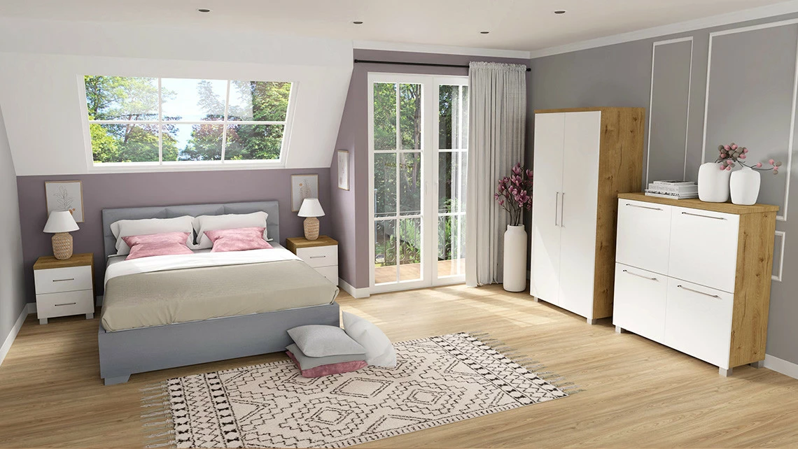 Do wyboru łóżka dla jednej lub dwóch osób o różnych szerokościach. Modne meble doskonale sprawdzą się nie tylko w domu czy w mieszkaniu, ale również w hotelu, apartamencie na wynajem lub pensjonacie. Tapicerowane posłania pasują do mebli sypialnianych wykonanych z płyty meblowej w odcieniu naturalnego jasnego drewna. Taki zestaw tworzy przytulną przestrzeń, w której każdy będzie się dobrze czuć.