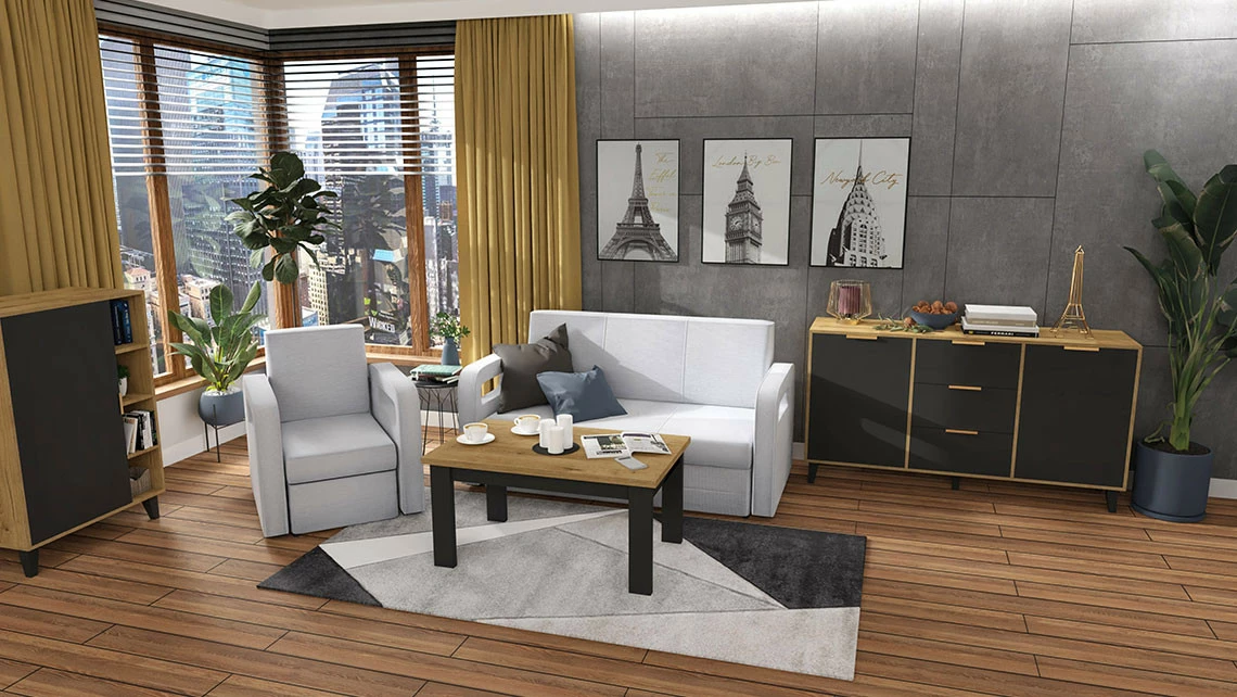 Szara kanapa pięknie się prezentuje w towarzystwie białych mebli z połyskiem oraz tych w kolorze naturalnego drewna. Wyposażenie salonu możemy wzbogacić o regał na książki, witrynę wyposażoną w oświetlenie LED czy szafę z drążkiem, jeśli brakuje nam osobnego pomieszczenia na sypialnię.