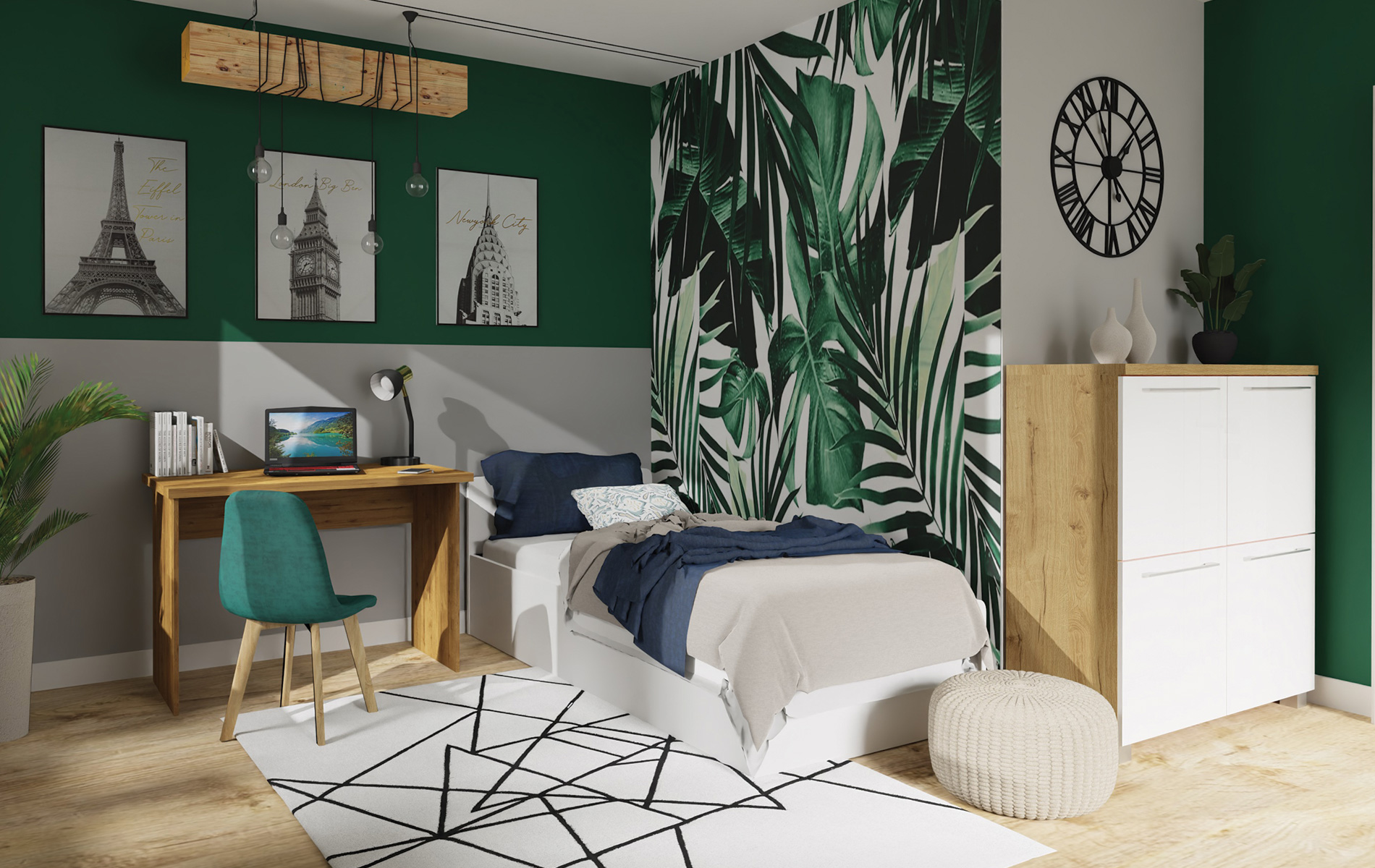 Obok łóżka znajduje się biurko w kolorze dąb soma ciemny, tworząc idealne miejsce do nauki i pracy. Jego solidna konstrukcja i przestronny blat zapewniają wygodę i funkcjonalność, a ciepły odcień drewna dodaje przytulnościkomoda Hawana, która dzięki połączeniu matowego białego lakieru z ciepłym odcieniem dębu soma ciemnego dodaje wnętrzu wyrafinowanego charakteru. Komoda oferuje dużo miejsca do przechowywania ubrań i innych niezbędnych rzeczy, co pomaga utrzymać porządek w pokoju.