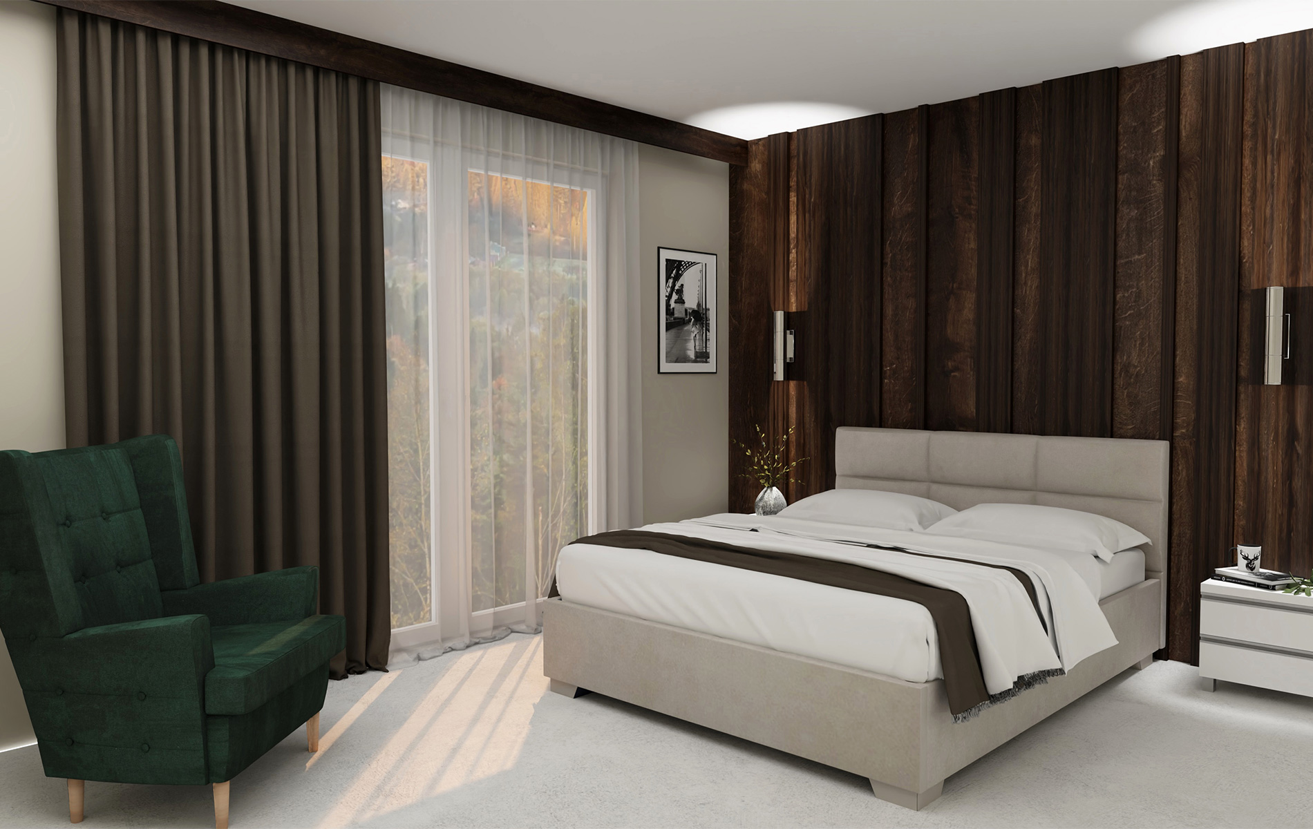 Obok łóżka znajduje się fotel Werina, którego głęboki, zielony kolor w pluszowym wykończeniu dodaje wnętrzu luksusu i kontrastu. Fotel ten jest idealnym miejscem do relaksu, czytania książki czy wypicia porannej kawy. Jego stylowy wygląd doskonale komponuje się z resztą mebli, tworząc harmonijną całość.