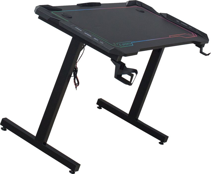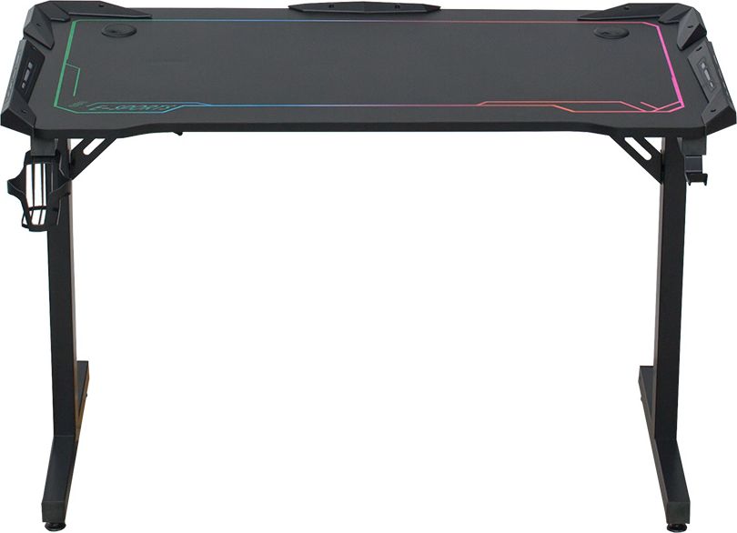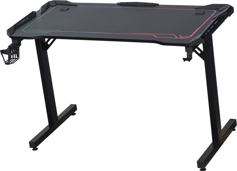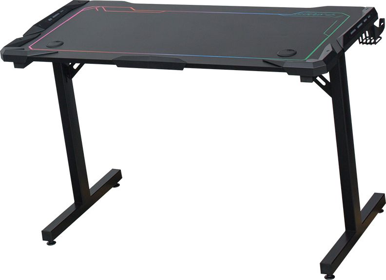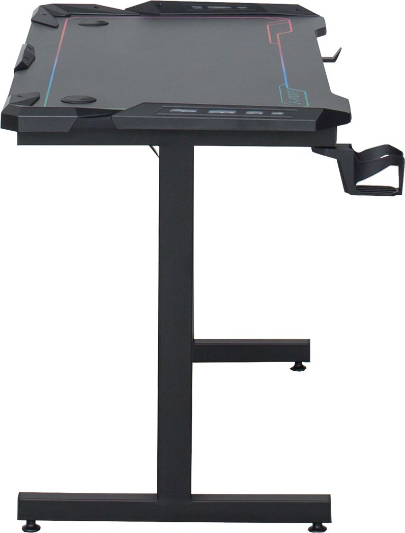 Biurko gamingowe TOKIO w kolorze czarnym to idealne rozwiązanie dla fanów gier komputerowych, jak i nie tylko. Wykonane z metalowej podstawy z drewnianym blatem. Biurko ma funkcje podświetlania światłami RGB (pilot). W zestawie znajduje się również uchwyt na słuchawki i napój oraz przewód do podłączenia komputera.