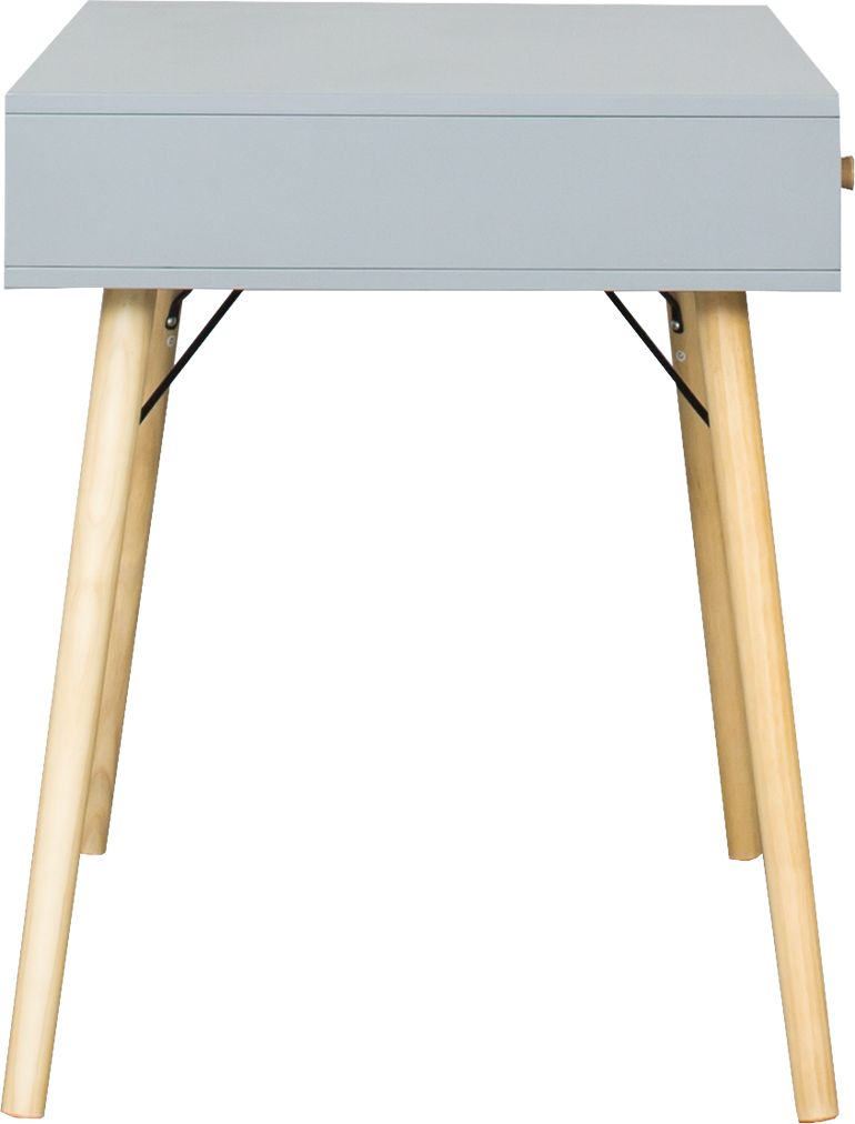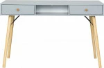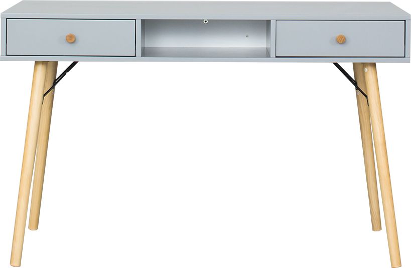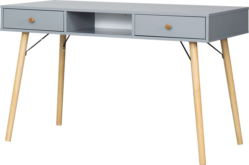 Biurko w stylu skandynawskim z kolekcji Lozanna to połączenia drewnianych nóg w naturalnym kolorze oraz szarej płyty MDF z subtelnymi elementami drewnianych uchwytów. Idealnie uzupełni pomieszczenia w nowoczesnym stylu a dzięki funkcjonalnej szufladzie pomieści drobne przedmioty.