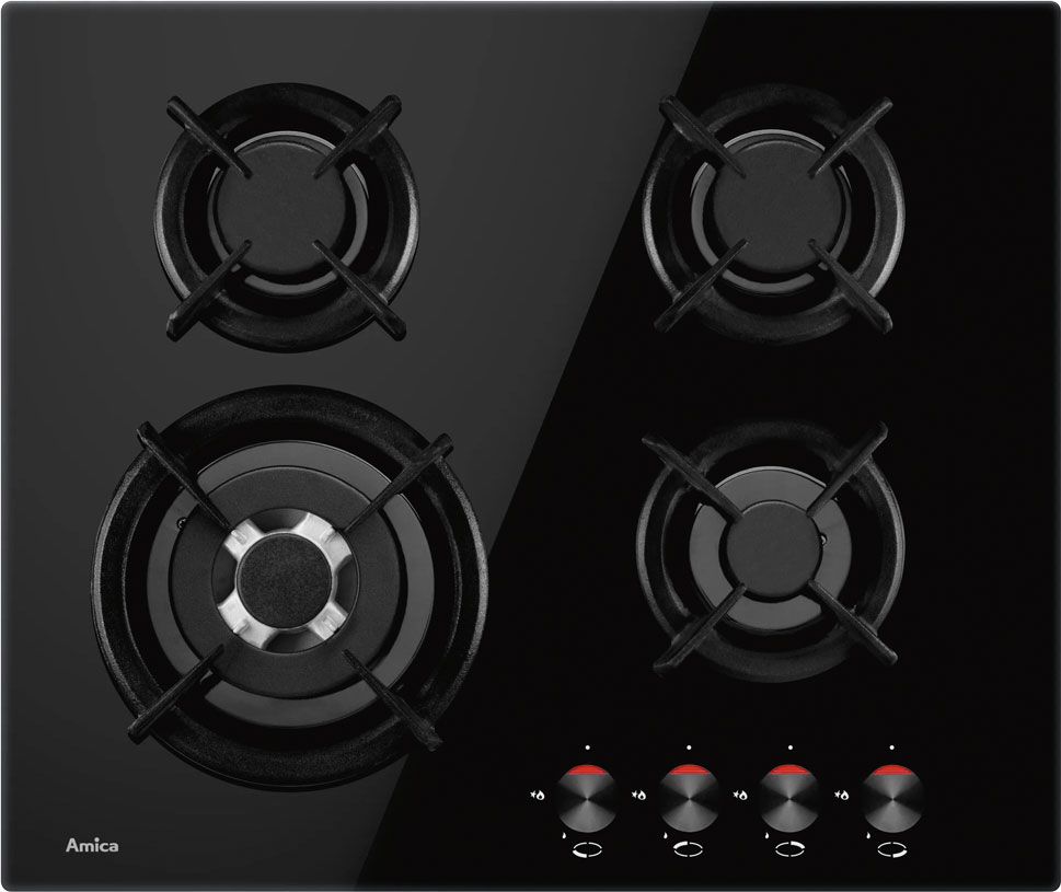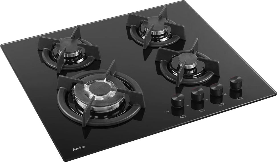 Płyta gazowa firmy Amica wykonana z hartowanego szkła. Płyta posiada żeliwne ruszty, elektryczny zapalacz gazu w pokrętle, zabezpieczenie przeciwwypływowe gazu oraz cztery palniki gazowe.