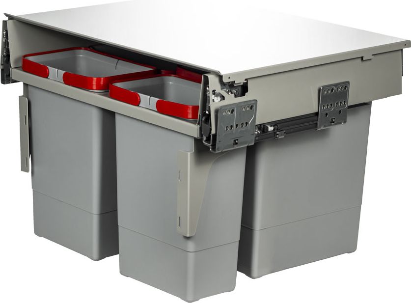 Kosz z czterema pojemnikami do segregacji odpadów pasujący do szafki kuchennej dolnej o szerokości 60 cm.