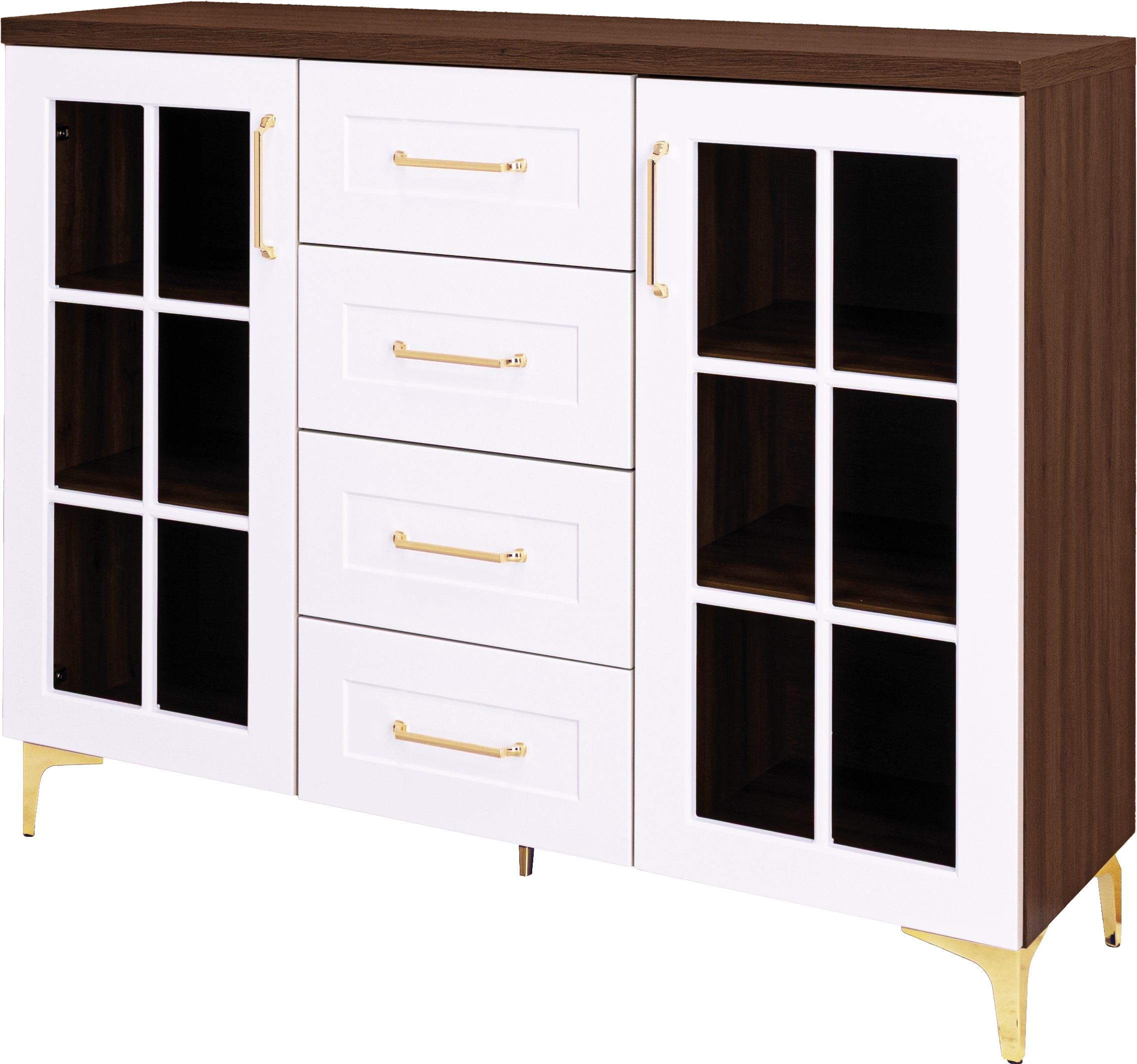 Komoda witryna HAWANA z czterema szufladami o wymiarach 134,5x106x42,5 cm to elegancki i funkcjonalny mebel do salonu lub jadalni. Połączenie białych, lakierowanych frontów z korpusem w kolorze orzech Foresta nadaje jej nowoczesny i wyrazisty charakter. Przeszklona część idealnie sprawdzi się do eksponowania dekoracji, a pojemne szuflady zapewniają praktyczne miejsce do przechowywania.
