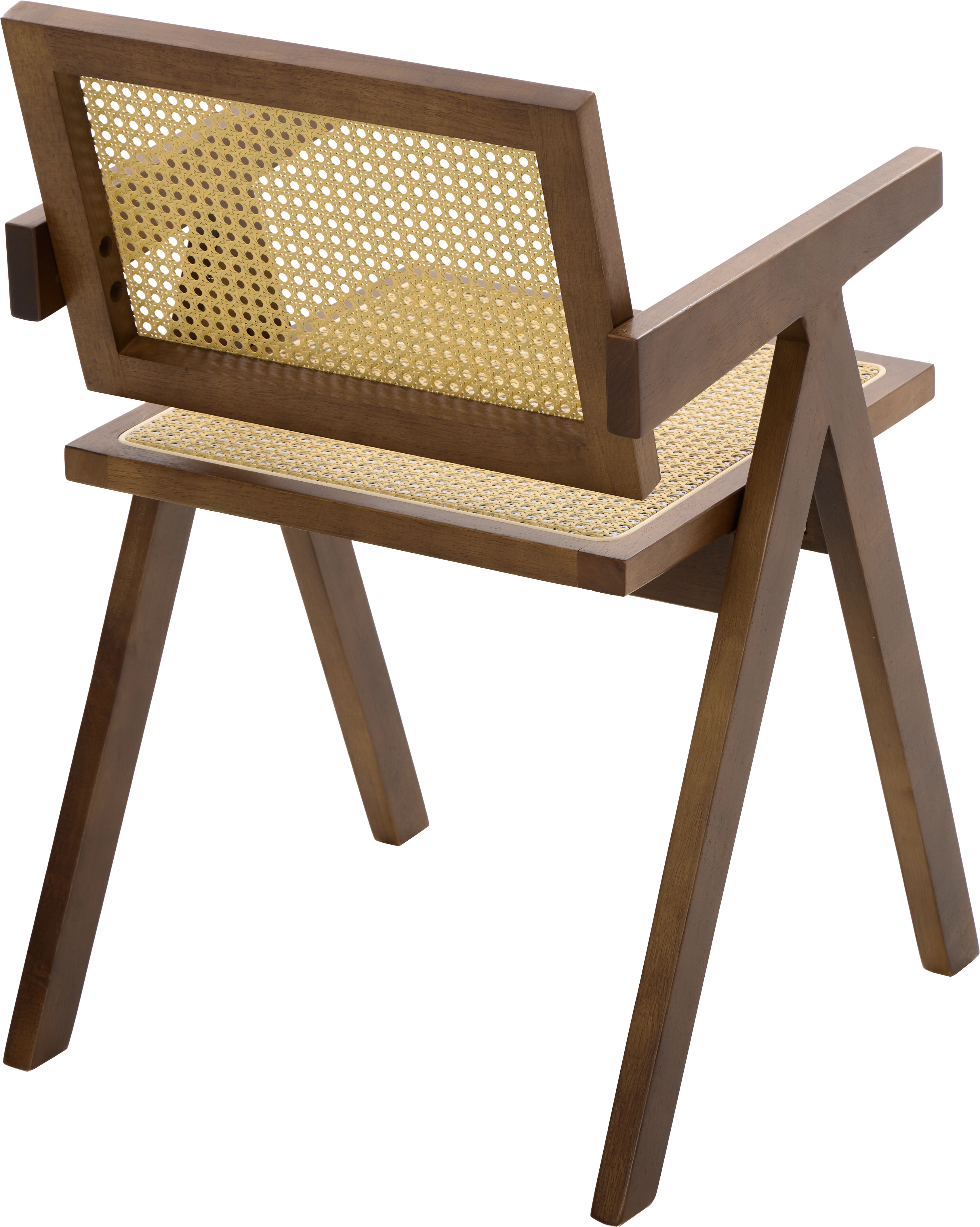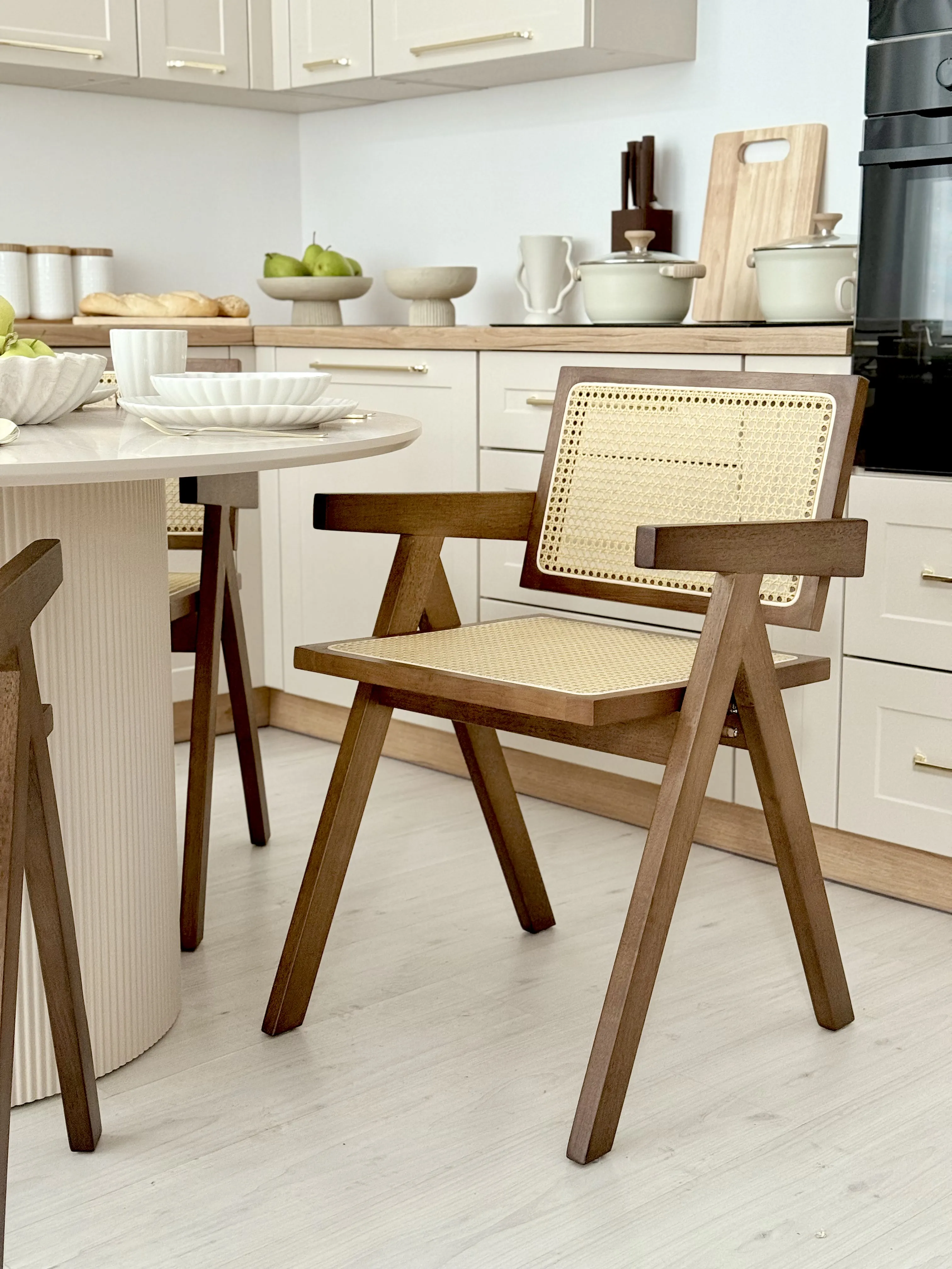 Krzesło drewniane „NERIVO”-41 to połączenie naturalnych materiałów, lekkości i ponadczasowego stylu. Wykonane na solidnym drewnianym stelażu w kolorze orzech, zachwyca ciepłym odcieniem i eleganckim wykończeniem, które idealnie komponuje się z wieloma aranżacjami wnętrz. Siedzisko oraz oparcie pokryte naturalnym rattanem nadają krzesłu lekkości, przewiewności i stylu inspirowanego trendami boho i vintage. Konstrukcja o udźwigu do 150 kg gwarantuje stabilność i trwałość.
