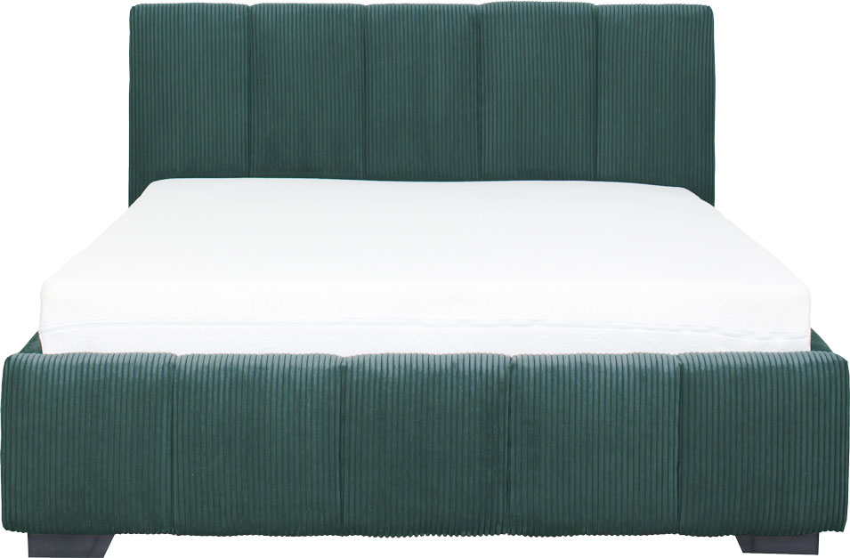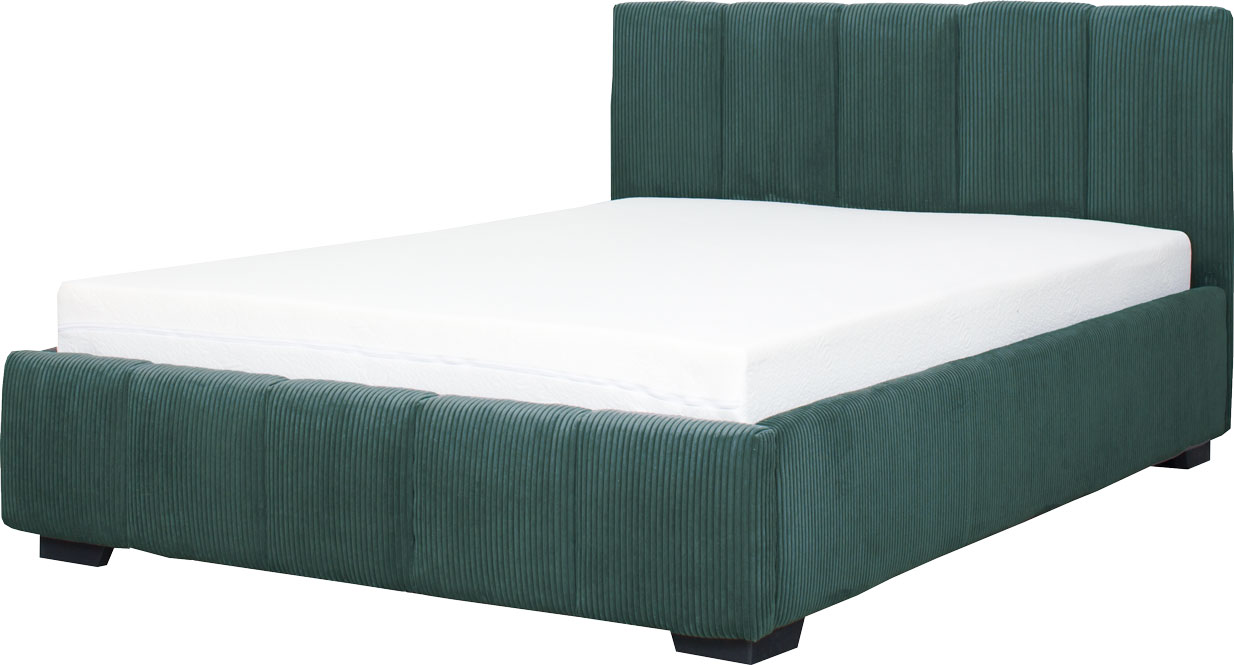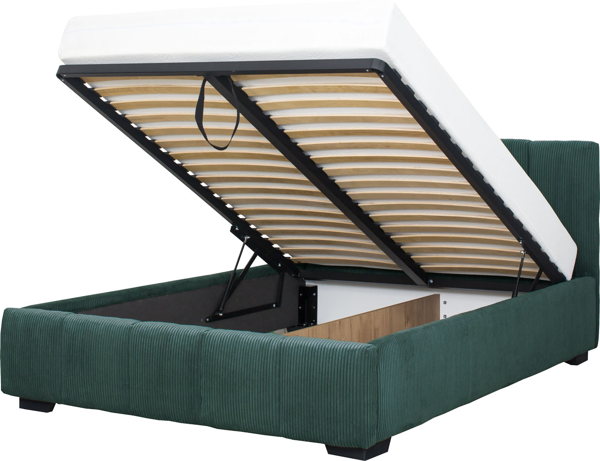 Łóżko tapicerowane 140 Mindy (sztruks zielony) ze stelażem i pojemnikiem