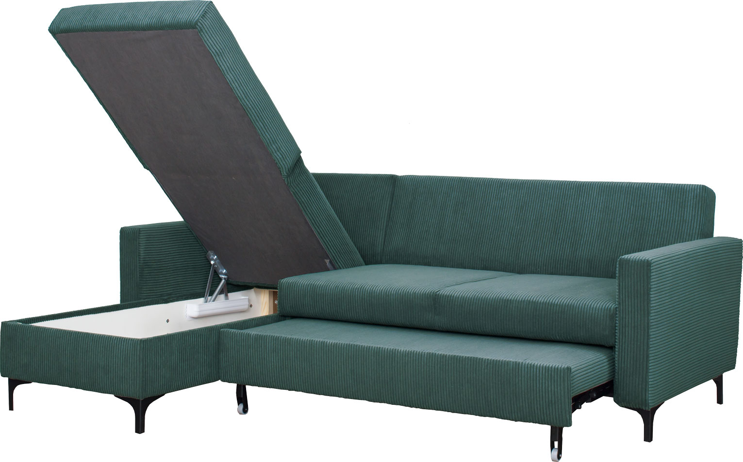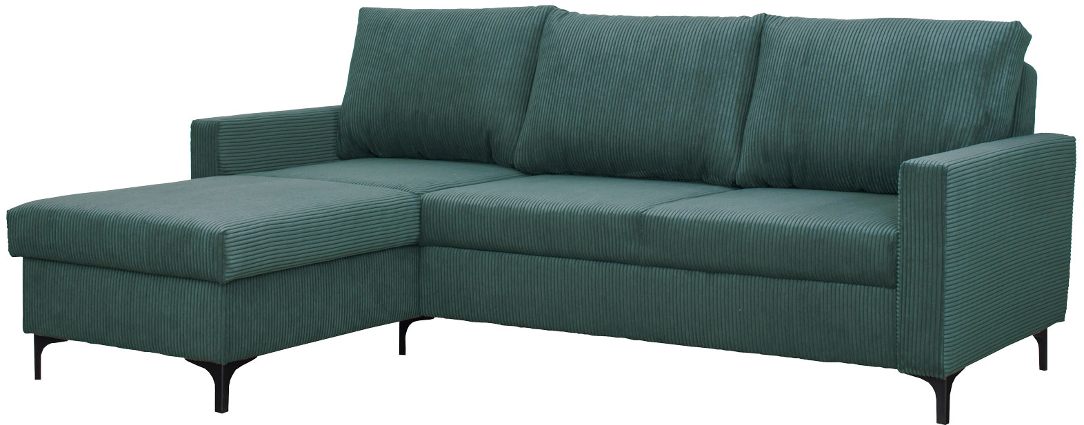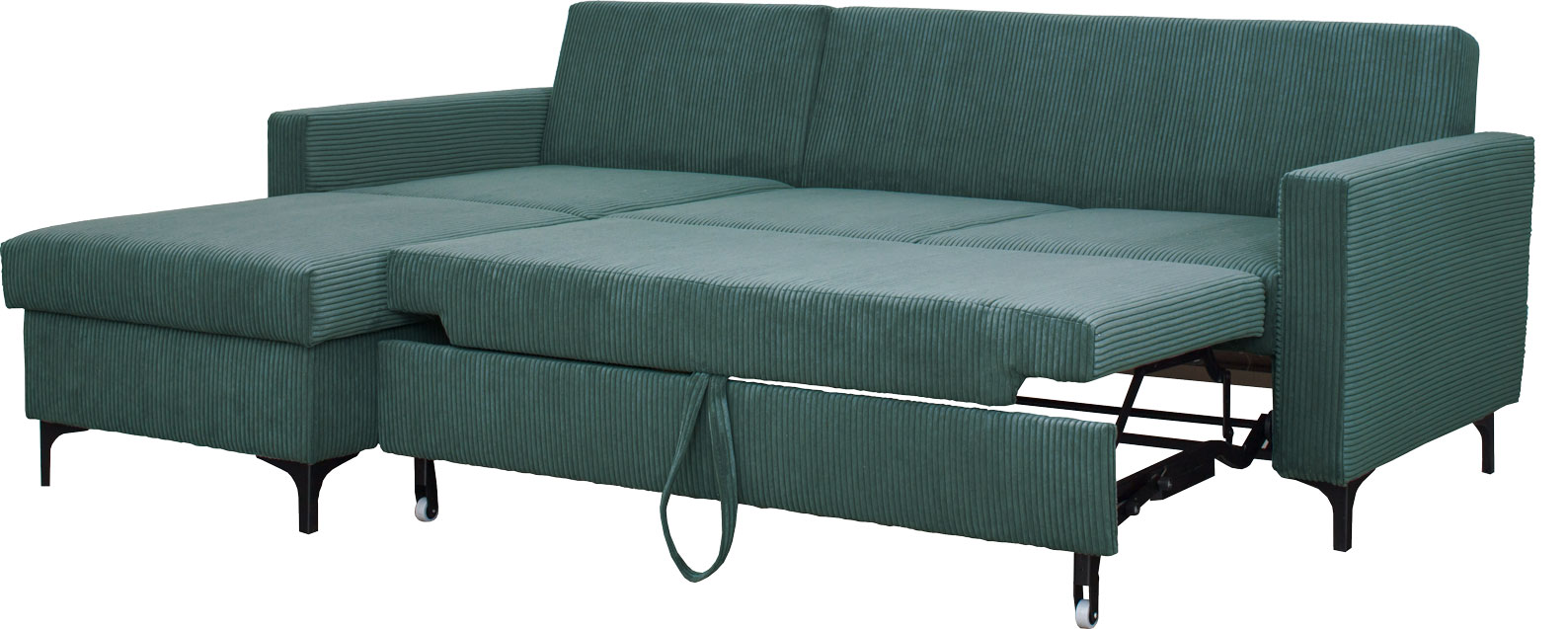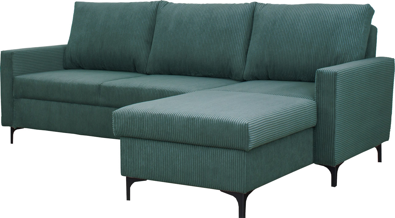 Narożnik tapicerowany Milano w materiale sztruks to wyjątkowe połączenie elegancji i komfortu. Materiał sztruks charakteryzuje się wyraźną, teksturowaną strukturą, która dodaje meblowi ciepłego i przytulnego wyglądu. Jego subtelne prążki wprowadzają do wnętrza elementy klasyki i nowoczesności jednocześnie. Wyposażony w praktyczną skrzynię na pościel, narożnik oferuje dodatkową przestrzeń do przechowywania, co pomaga w utrzymaniu porządku. Nowoczesny automat do rozkładania umożliwia łatwe przekształcenie narożnika w wygodne łóżko, a metalowe stopki w kolorze czarnym dodają nowoczesnego akcentu i umożliwiają swobodne wjeżdżanie robota sprzątającego pod mebel. Narożnik Milano w materiale sztruks łączy estetykę z funkcjonalnością, tworząc stylowe i praktyczne rozwiązanie do każdego wnętrza.