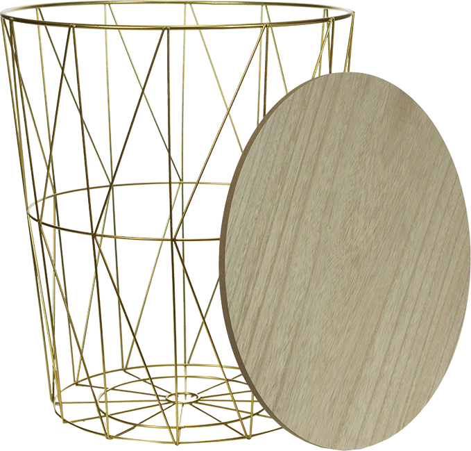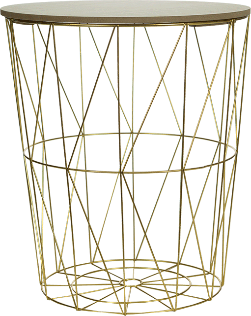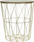 Okrągły stolik druciany Marino w kolorze złotym to modernistyczny, niezwykle funkcjonalny mebel. Umożliwia przechowywanie poduszek, kocy, prasy czy książek. Zdejmowany blat sprawdzi się jako taca czy podkładka do pisania.