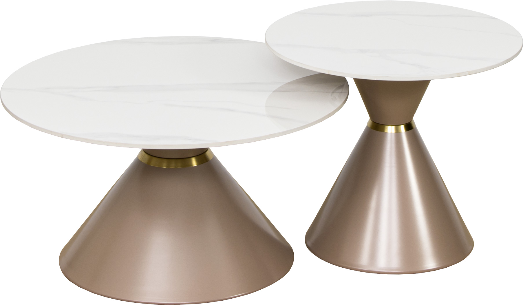 Zestaw dwóch stolików Morino to elegancka propozycja do stylowych wnętrz. Stoliki mają ceramiczne blaty w kolorze biały-marmur, które nadają im klasyczny i elegancki wygląd, a jednocześnie są trwałe i łatwe w pielęgnacji. Nogi w kolorze brązowym dodają im ciepła i harmonijnie komponują się z marmurowym wzorem.