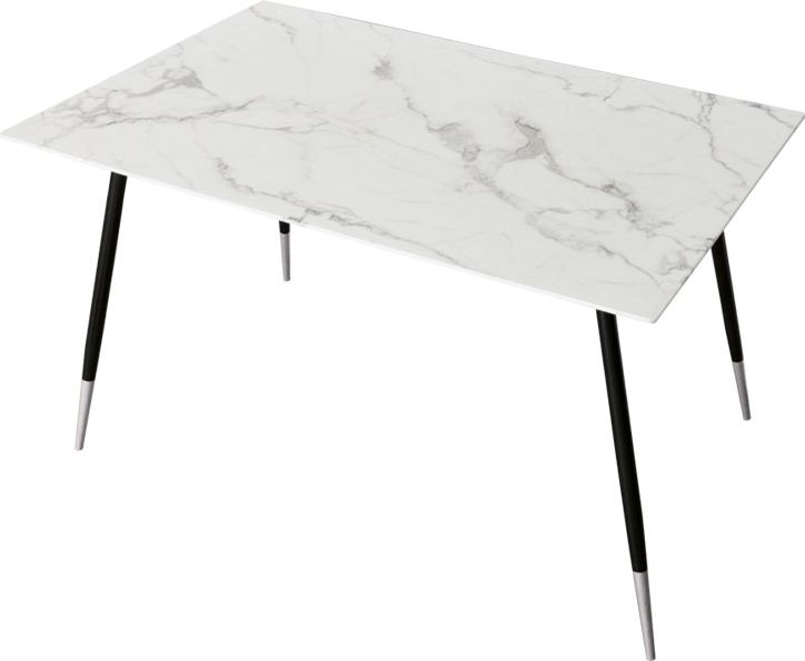 Stół z kolekcji Silvero z bardzo charakterystycznym marmurkowym blatem wykonanym ze szkła hartowanego w kolorze białym, łatwym do utrzymania w czystości. Metalowe czarne nogi ze srebrnym wykończeniem dodają całości ciekawego efektu wizualnego. Stół Silvero to praktyczny mebel o szerokim zastosowaniu.