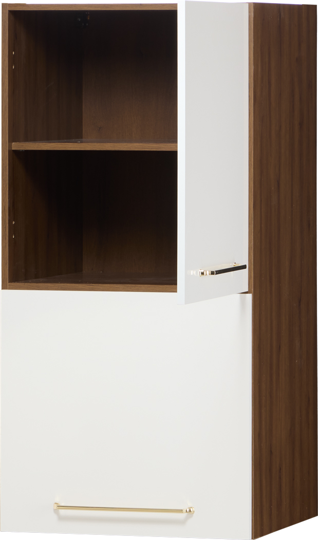Zabudowa nadblatowa prawa „LOARA” w wykończeniu biały połysk to nowoczesne i eleganckie rozwiązanie do kuchni, które łączy jasny, rozświetlający front z ciepłym akcentem naturalnego drewna. Korpus w kolorze Orzech Foresta nadaje zabudowie wyrazisty i stylowy charakter.