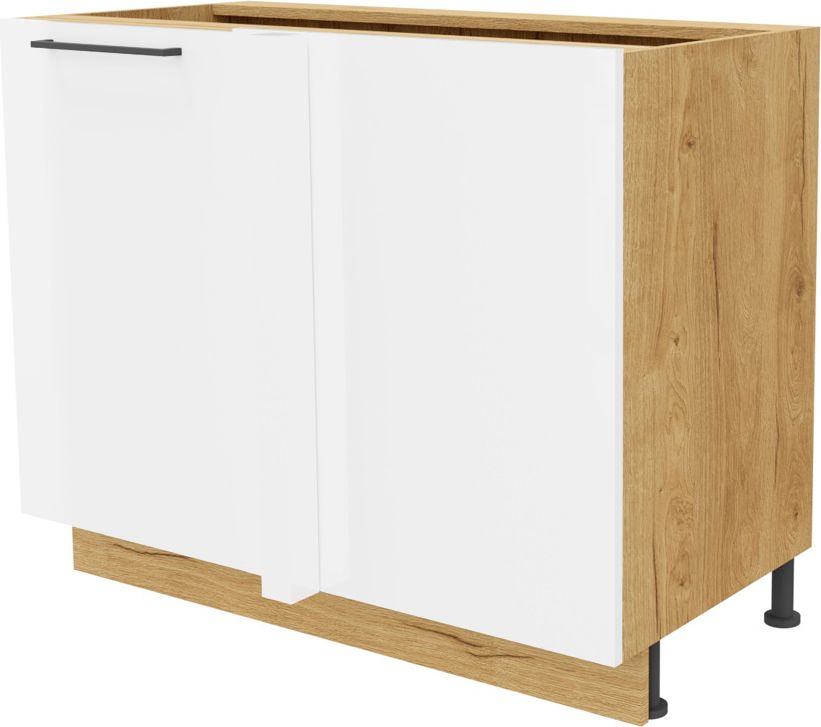 Narożna dolna prosta szafka Bellona o szerokości 103 cm, otwierana na prawą stronę, jest wyposażona w kosz cargo typu nerka. Dzięki wysuwanym półkom, zapewnia łatwy dostęp do akcesoriów kuchennych, optymalizując przestrzeń w kuchni. Zawiasy z funkcją samodomykania gwarantują ciche i płynne zamykanie drzwi, łącząc funkcjonalność z eleganckim designem.