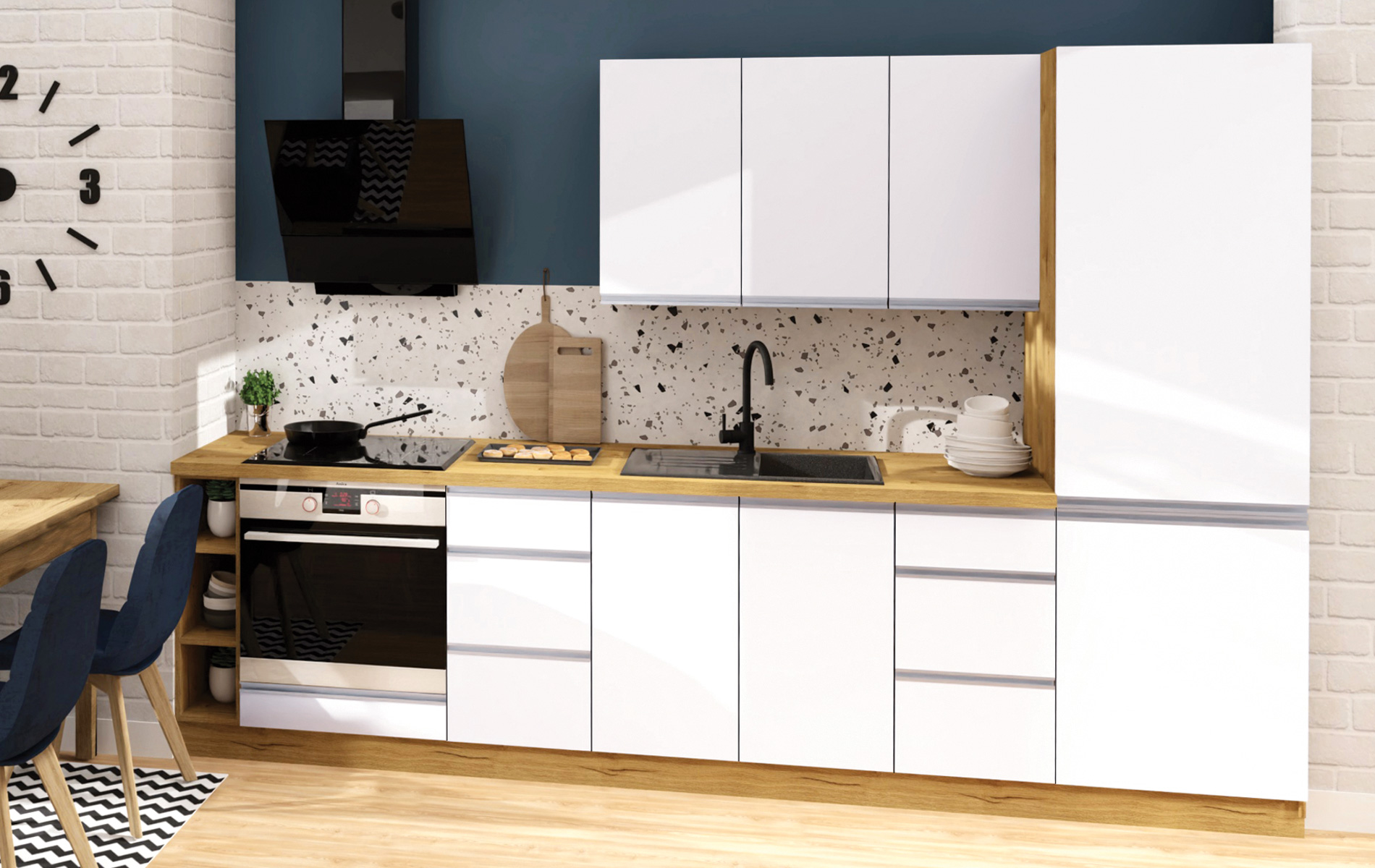Meble kuchenne Monia w kolorze biały połysk i dąb soma ciemny łączą nowoczesny design z elegancją. Białe, lakierowane fronty w połysku oraz ciepłe akcenty dębu soma ciemnego tworzą efektowny kontrast, który dodaje kuchni stylu i przestronności. Funkcjonalne rozwiązania i wysokiej jakości materiały zapewniają trwałość oraz wygodę, idealnie wpisując się w nowoczesne aranżacje.