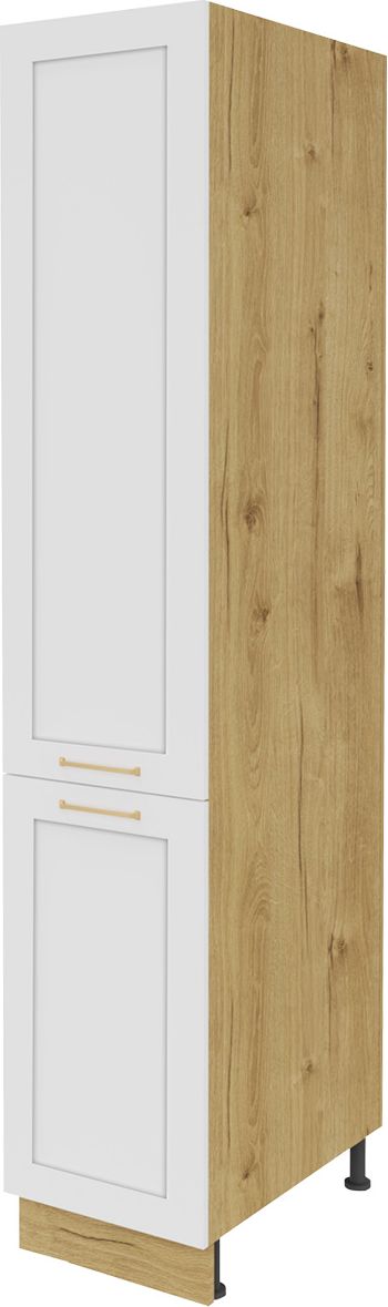 Kuchnia Laurencja z frezowanymi i lakierowanymi frontami wykończonymi na mat, bokami w kolorze dąb Soma ciemny oraz złotymi uchwytami, to meble wykonane i pasujące do stylu glamour oraz prowansalskiego. Klasyczna stylistyka pozwala na dopasowanie ich do różnego rodzaju wnętrz, począwszy od małych skromnych pomieszczeń, do dużych apartamentowców. Dzięki swojej elegancji pozwolą zaspokoić nawet najbardziej wymagających Klientów. Połączenie bieli z dębem pozostaje zawsze modne i cieszy się dużym zainteresowaniem wśród kupujących i projektantów wnętrz. Dodatkowym atutem mebli Laurencja są dopasowane cokoły oraz szafki pasujące do wyższych pomieszczeń.
