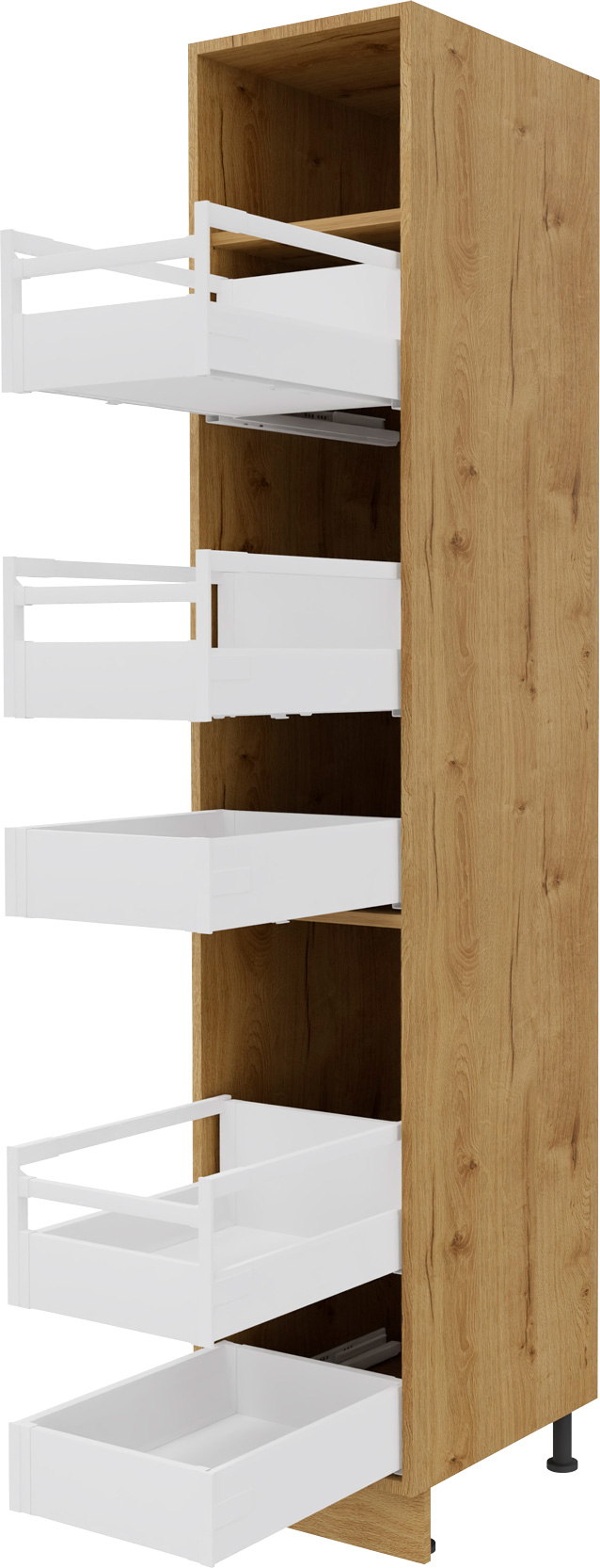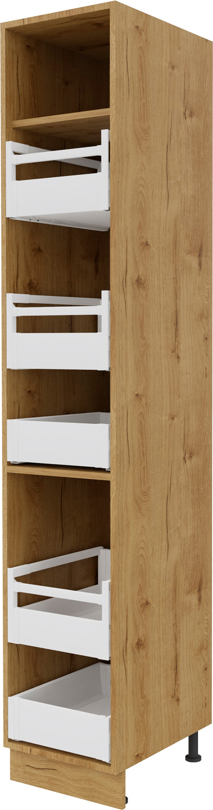 Zabudowa gospodarcza prawa Monia o szerokości 40 cm, wyposażona w szuflady wewnętrzne, to praktyczne rozwiązanie do organizacji przestrzeni w kuchni. Solidna konstrukcja i elegancki design sprawiają, że szafka łączy funkcjonalność z nowoczesnym stylem. Idealna do przechowywania artykułów AGD, środków czystości czy akcesoriów kuchennych, zapewnia wygodny dostęp do zawartości dzięki szufladom.