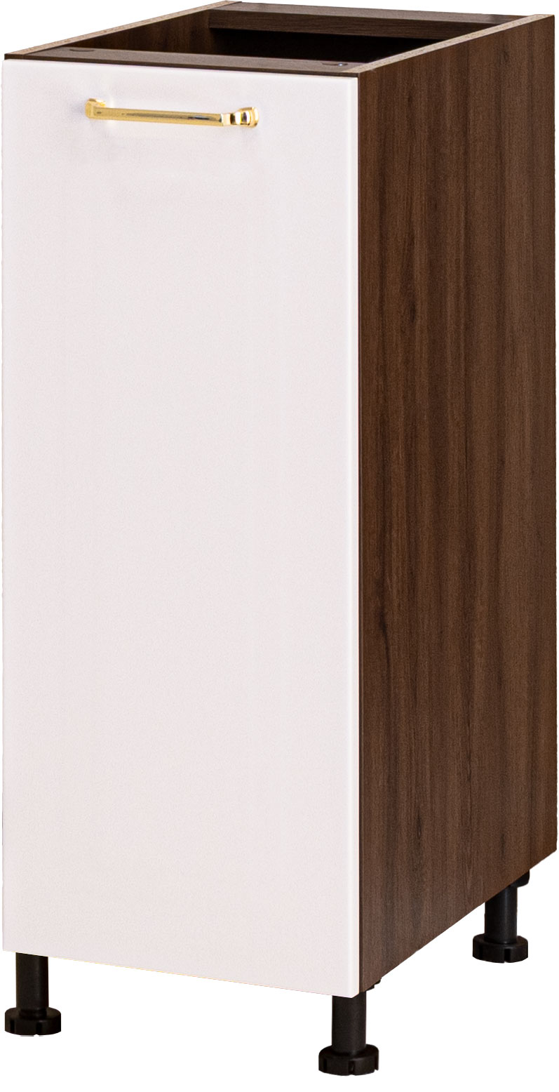 Dolna szafka prawa o szerokości 30 cm to funkcjonalny i estetyczny element kolekcji Loara. Front w białym połysku podkreśla nowoczesny, czysty wygląd mebla, natomiast korpus w odcieniu orzech Foresta zapewnia harmonijne połączenie z resztą zabudowy.