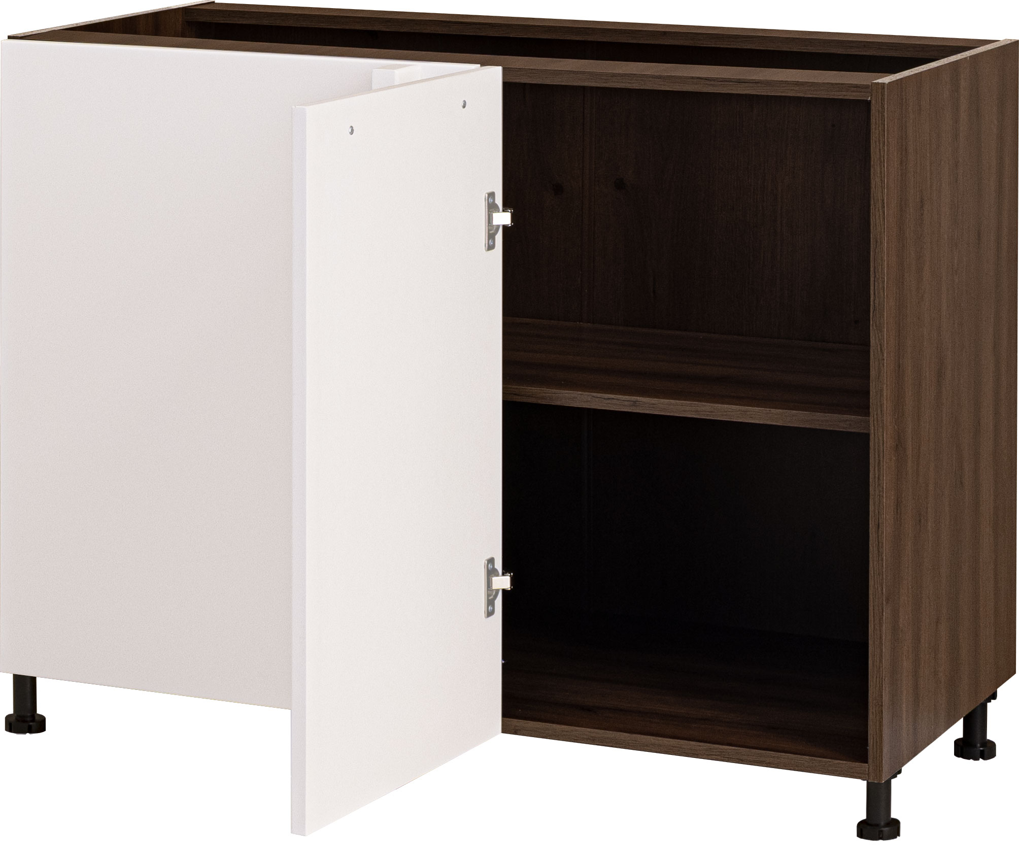 Dolna szafka narożna prosta w wersji lewej to funkcjonalne rozwiązanie, które pozwala optymalnie wykorzystać przestrzeń w rogu kuchni. Front w białym połysku nadaje meblowi elegancki, nowoczesny charakter, a korpus w odcieniu orzech Foresta zapewnia spójne wykończenie zabudowy.