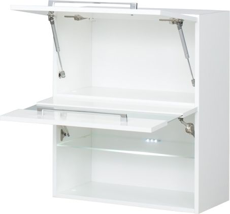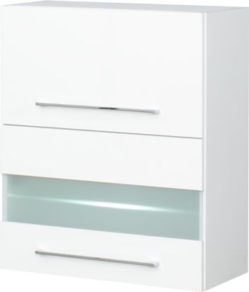 Funkcjonalna górna szafka kuchenna Loara o szerokości 60 cm, wyposażona w witrynę z mleczną szybą i półki z podświetleniem LED. Drzwi otwierane do góry, co zapewnia wygodny dostęp do wnętrza. Zawiasy zastosowane w szafce posiadają funkcję samodomykania, gwarantując ciche i płynne zamykanie. Idealna do nowoczesnych kuchni, łącząca funkcjonalność z eleganckim designem.