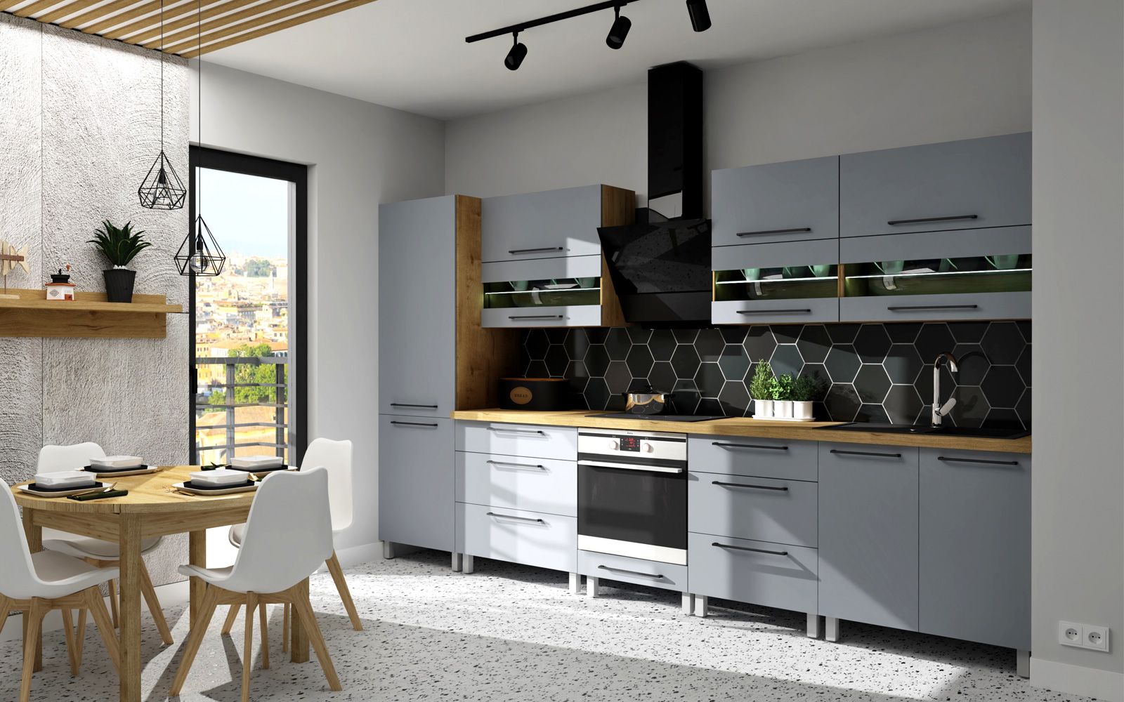 Meble kuchenne Monia w kolorze szarym i dąb soma ciemny łączą nowoczesny design z eleganckim wykończeniem. Szare fronty oraz ciepły odcień dębu soma ciemnego tworzą harmonijną i stylową przestrzeń. Funkcjonalne rozwiązania i wysokiej jakości materiały zapewniają trwałość oraz wygodę użytkowania, idealnie wpisując się w współczesne aranżacje kuchenne.