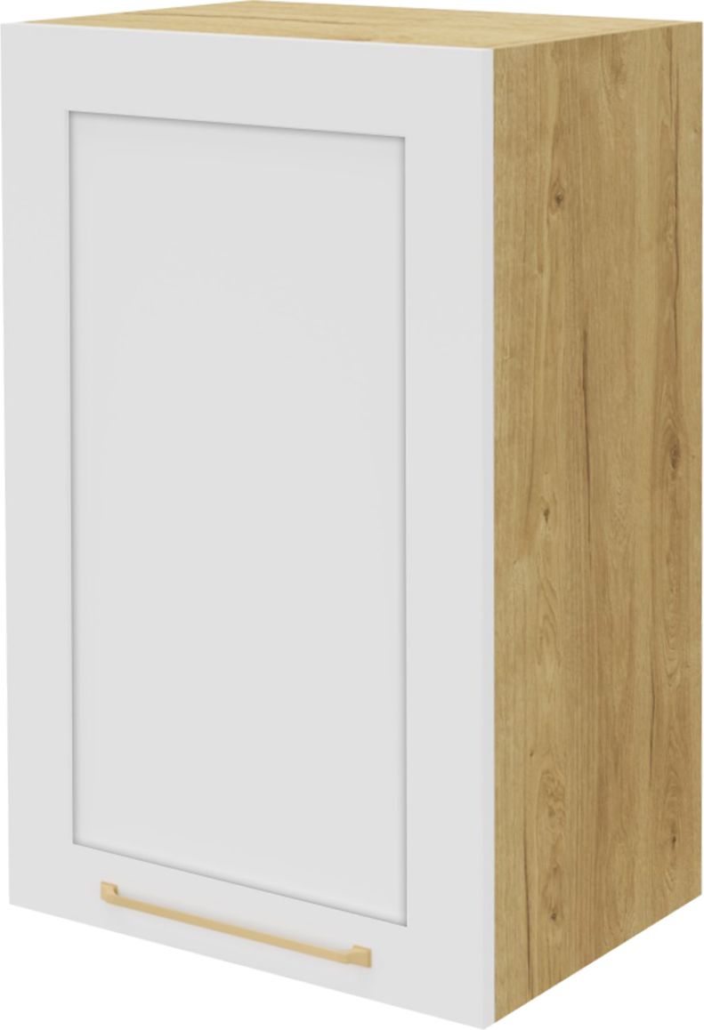 Funkcjonalna górna szafka kuchenna Laurencja o szerokości 45 cm z drzwiami otwieranymi w lewą stronę to praktyczne rozwiązanie do przechowywania w kuchni. Zawiasy szafki wyposażone są w funkcję samodomykania, co zapewnia ciche i płynne zamykanie. Jej nowoczesny design oraz odpowiednia szerokość sprawiają, że szafka doskonale wpisuje się w różne aranżacje kuchenne, łącząc estetykę z funkcjonalnością.
