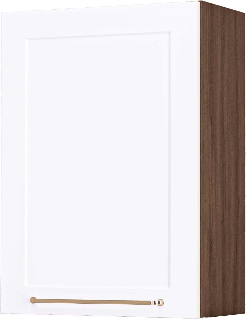 Górna szafka prawa o szerokości 50 cm to elegancki i pojemny moduł kolekcji Laurencja, idealny do tworzenia funkcjonalnej i spójnej zabudowy kuchennej. Front w białym lakierze matowym z delikatnym frezowaniem podkreśla klasyczny, dopracowany wygląd mebla, a korpus w ciepłym odcieniu drewna orzech Foresta wnosi do wnętrza naturalną harmonię i przytulny charakter.