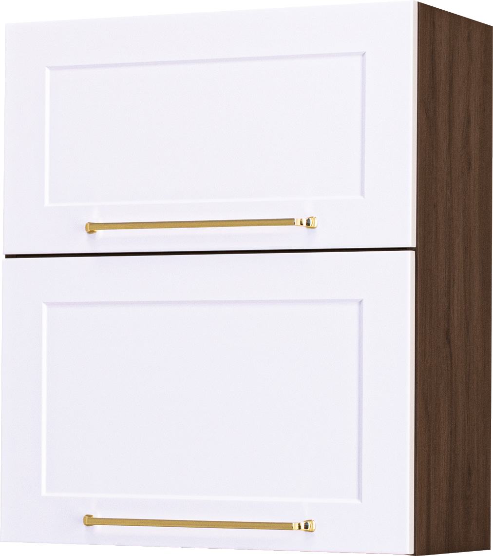 Górna szafka o szerokości 60 cm, dzielona poziomo i wyposażona w pełny front, to elegancki i praktyczny element kolekcji Laurencja. Front w białym lakierze matowym z subtelnym frezowaniem podkreśla klasyczny, dopracowany charakter mebla, a poziome podziały dodają mu nowoczesnej lekkości.