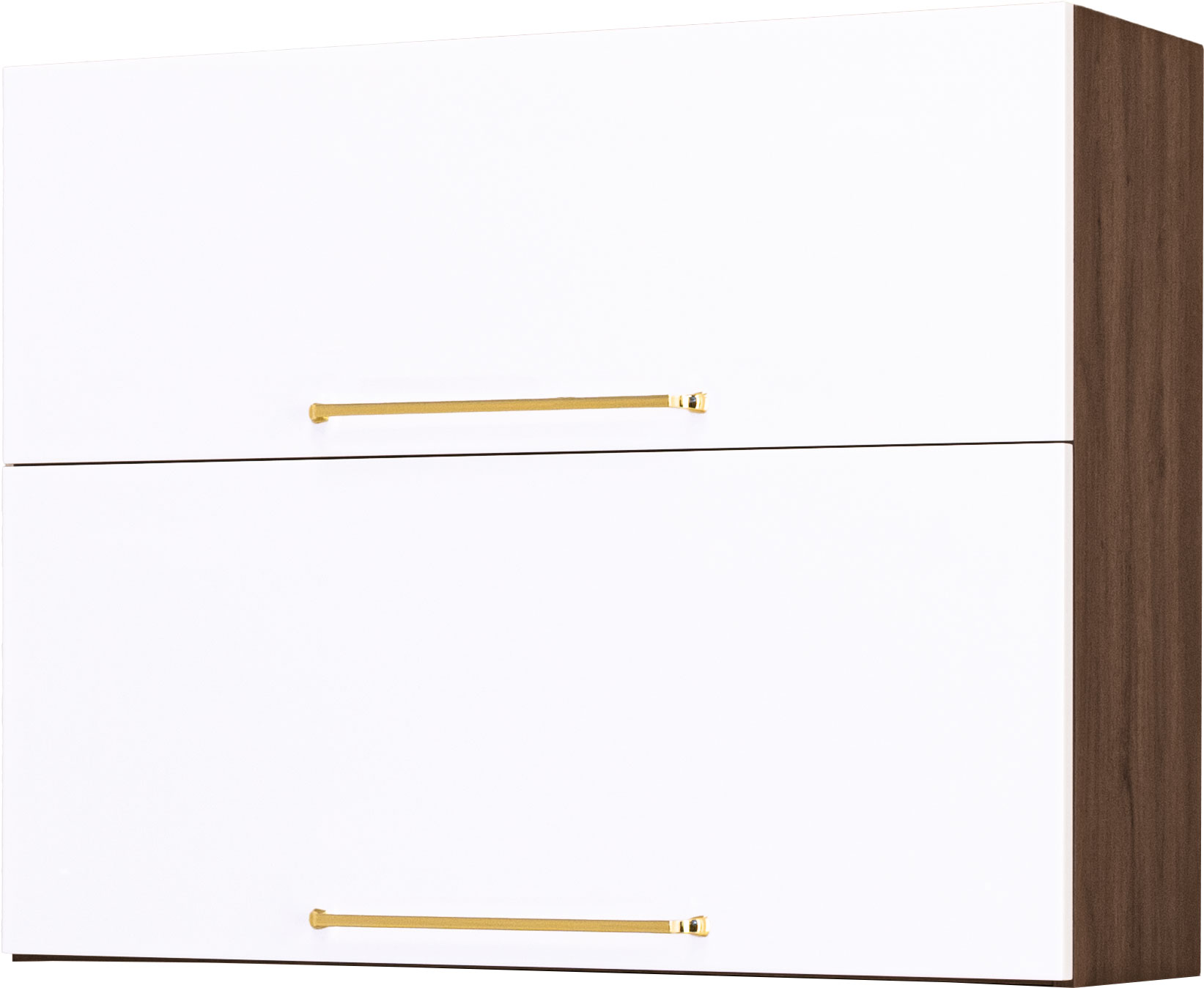 Górna szafka o szerokości 90 cm z poziomym podziałem frontu to nowoczesny i elegancki element kolekcji Loara. Pełny front w białym połysku nadaje meblowi minimalistycznego, czystego charakteru, a korpus w odcieniu orzech Foresta zapewnia spójność z resztą zabudowy.