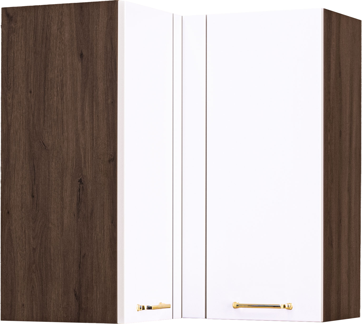 Górna szafka narożna w układzie „L” to praktyczny i estetyczny element kolekcji Loara, pozwalający na maksymalne wykorzystanie przestrzeni narożnej. Front w białym połysku nadaje meblowi nowoczesnego, eleganckiego charakteru, natomiast korpus w odcieniu orzech Foresta zapewnia spójne wykończenie całej zabudowy.