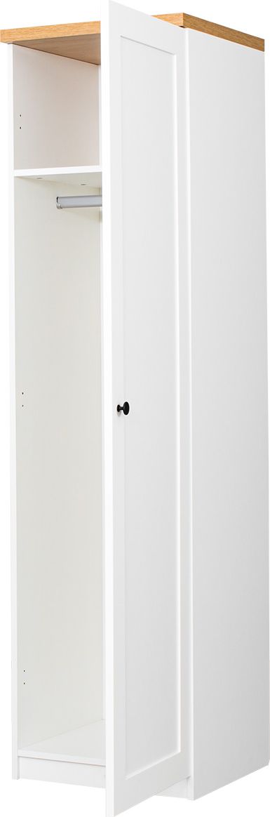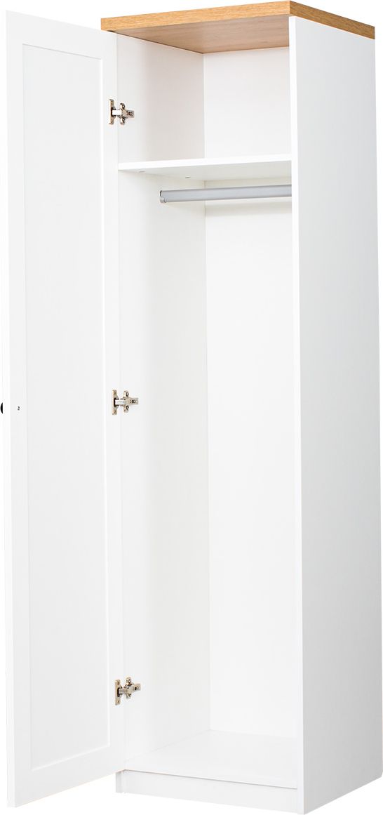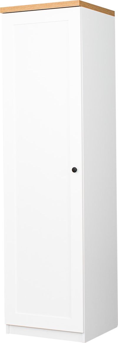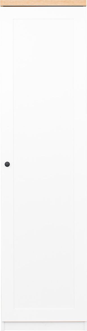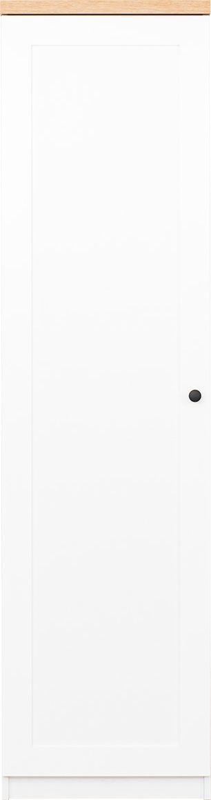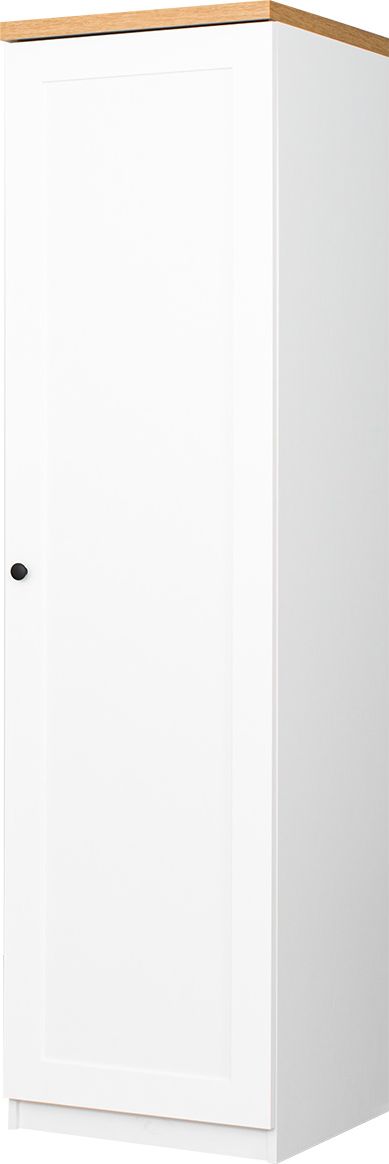 Półszafa uniwersalna z drążkiem Toskania w kolorze biały/dąb Soma ciemny to praktyczne rozwiązanie do przechowywania ubrań i akcesoriów. Klasyczne połączenie białego lakieru z dębowym wykończeniem Soma ciemny nadaje meblowi elegancki wygląd, który doskonale komponuje się z nowoczesnymi wnętrzami. Mebel posiada drążek na wieszaki, co ułatwia organizację ubrań, oraz drzwi otwierane w prawą lub lewą stronę, które można dostosować podczas montażu, zapewniając większą elastyczność aranżacyjną i funkcjonalność w użytkowaniu.