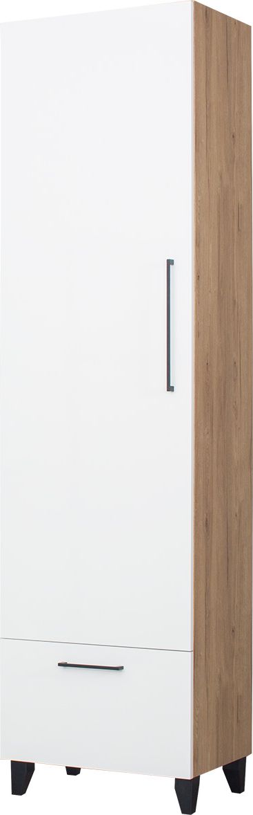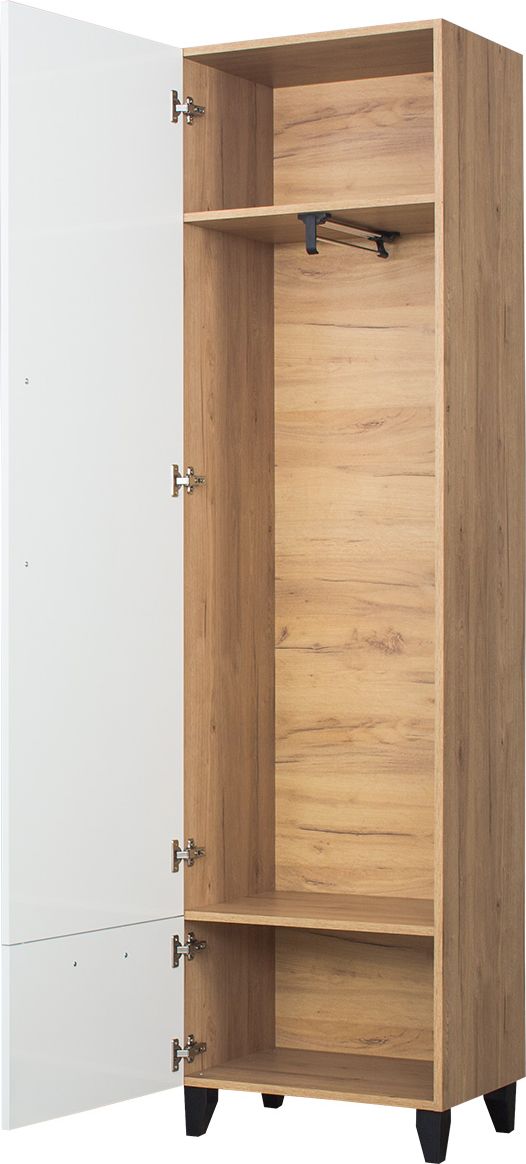 Półszafa Mastania, dzięki wysuwanym drążkom, umożliwia wygodne i łatwe wyciąganie ubrań, co znacząco ułatwia organizację i dostęp do garderoby. To praktyczne rozwiązanie, które zwiększa funkcjonalność mebla i komfort użytkowania. Drzwi otwierane w lewą stronę.