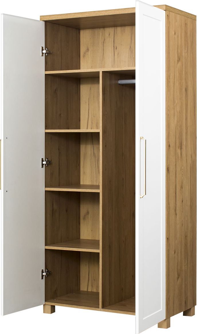 Szafa dwudrzwiowa z półkami i drążkiem z kolekcji Hawana to funkcjonalne rozwiązanie do przechowywania odzieży i innych przedmiotów w stylowy sposób. Dzięki drzwiom zapewnia łatwy dostęp do wnętrza, gdzie znajdują się półki i drążek na wieszaki, umożliwiające efektywne zorganizowanie przestrzeni. Solidne wykonanie oraz nowoczesny design sprawiają, że szafa ta doskonale komponuje się z różnymi wnętrzami, dodając im elegancji i praktyczności. Idealna do sypialni, garderoby lub pokoju dziennego, gdzie potrzebne jest funkcjonalne rozwiązanie do przechowywania ubrań i innych rzeczy.