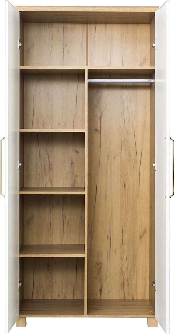 Szafa wysoka dwudrzwiowa z półkami i drążkiem Hawana (biały lakier mat/dąb Soma ciemny)