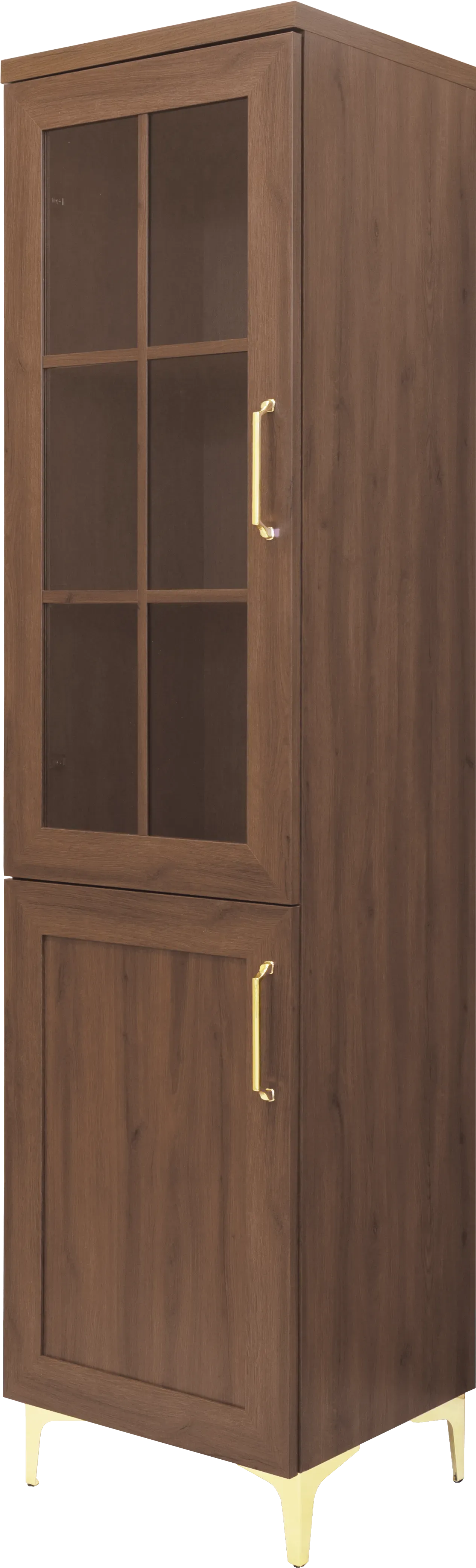 Witryna MA05L z kolekcji MAJORKA to wąski, elegancki mebel w kolorze orzech Foresta o wymiarach 50 x 197 x 35,5 cm. Jest to wersja lewa – zawiasy umożliwiają otwieranie drzwi na lewą stronę. Przeszklony front pozwala na estetyczne wyeksponowanie dekoracji, szkła lub kolekcji, a półki wewnątrz zapewniają praktyczne miejsce do przechowywania. Ciepły odcień drewna i klasyczna forma sprawiają, że witryna doskonale komponuje się z pozostałymi elementami systemu MAJORKA – zarówno w salonie, jadalni, jak i gabinecie.