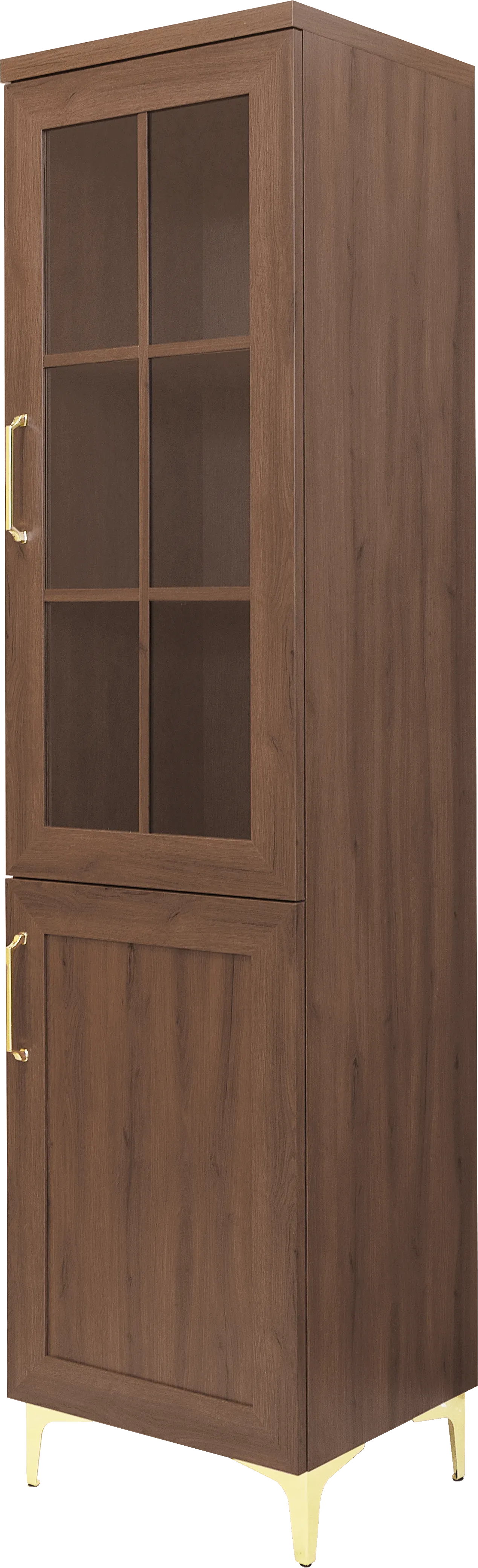 Witryna MA05P z kolekcji MAJORKA to wąski, elegancki mebel w kolorze orzech Foresta o wymiarach 50 x 197 x 35,5 cm. Jest to wersja prawa – zawiasy umożliwiają otwieranie drzwi na prawą stronę. Przeszklony front pozwala na estetyczne wyeksponowanie dekoracji, szkła lub kolekcji, a półki wewnątrz zapewniają praktyczne miejsce do przechowywania. Ciepły odcień drewna i klasyczna forma sprawiają, że witryna doskonale komponuje się z pozostałymi elementami systemu MAJORKA – zarówno w salonie, jadalni, jak i gabinecie.