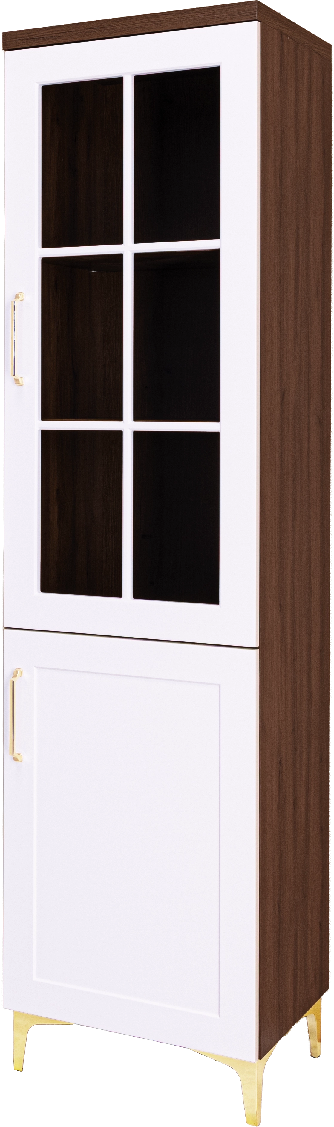 Witryna prawa "HAWANA" to elegancki mebel łączący nowoczesne wykończenie z funkcjonalnością. Biały front świetnie współgra z korpusem w ciepłym odcieniu orzech Foresta, tworząc efektowną i stylową kompozycję. Witryna wyposażona jest w przeszklone drzwi, za którymi można wyeksponować dekoracje, ceramikę lub książki. Smukła forma sprawia, że idealnie sprawdzi się także w mniejszych pomieszczeniach. Wymiary: 50 × 197 × 36,5 cm.